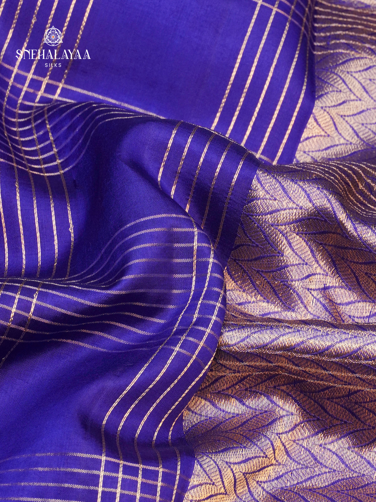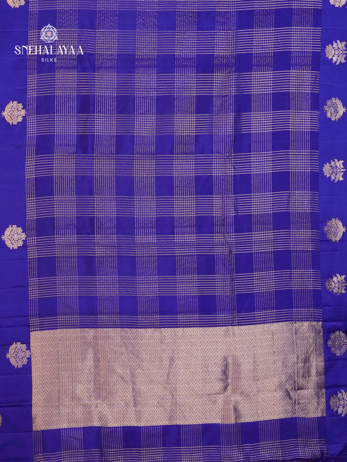 This elegant banaras ponna silk saree features a royal blue body adorned with delicate silver zari checks and a signature floral butta