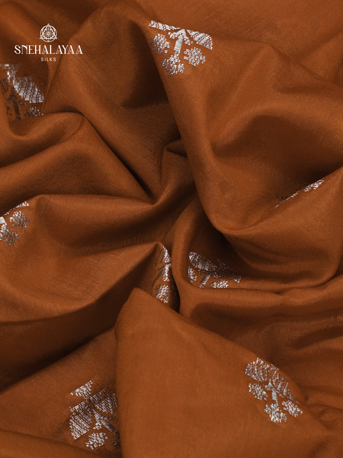Brick red Chiniya silk saree featuring subtle woven floral motifs across the body and a finely detailed cream zari border. Smooth texture, lightweight weave, neat finish, and a graceful, structured drape.