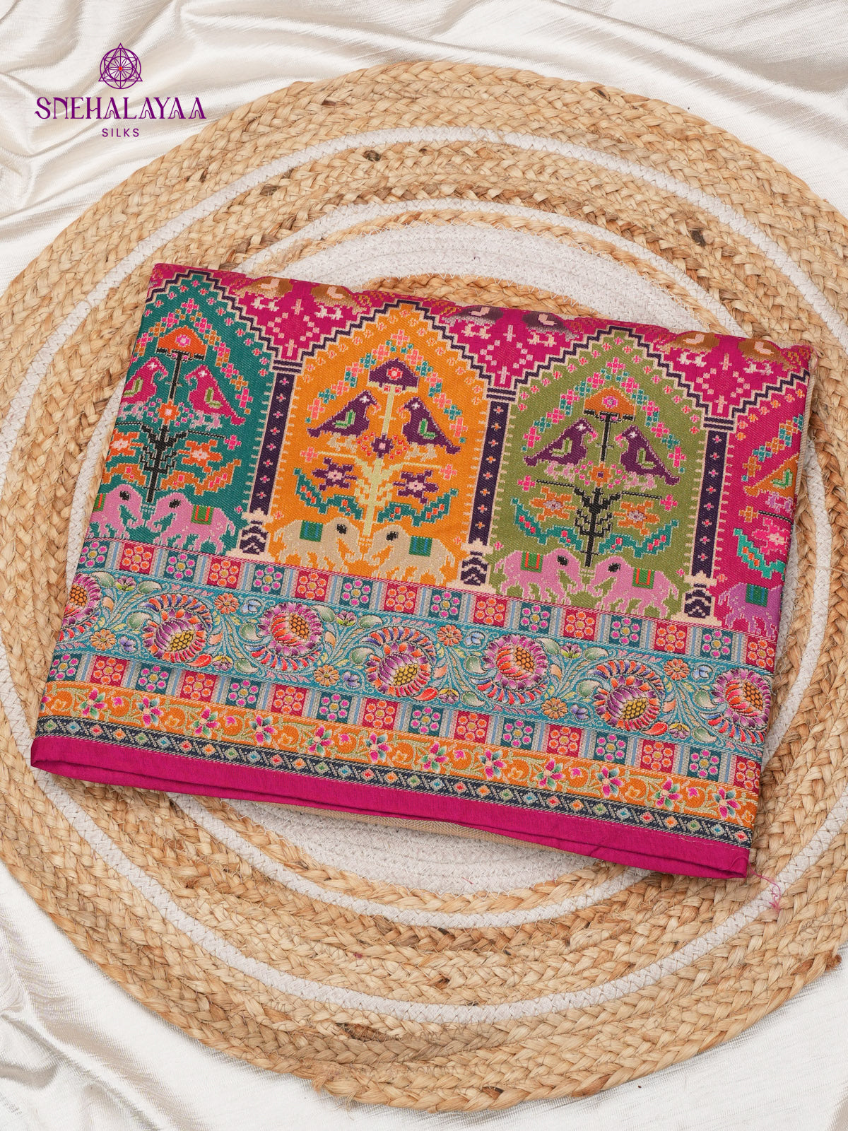 A Banaras silk saree adorned with a delicate floral border, woven with rich traditional craftsmanship. Its lustrous fabric and intricate motifs create an elegant blend of heritage and timeless beauty.