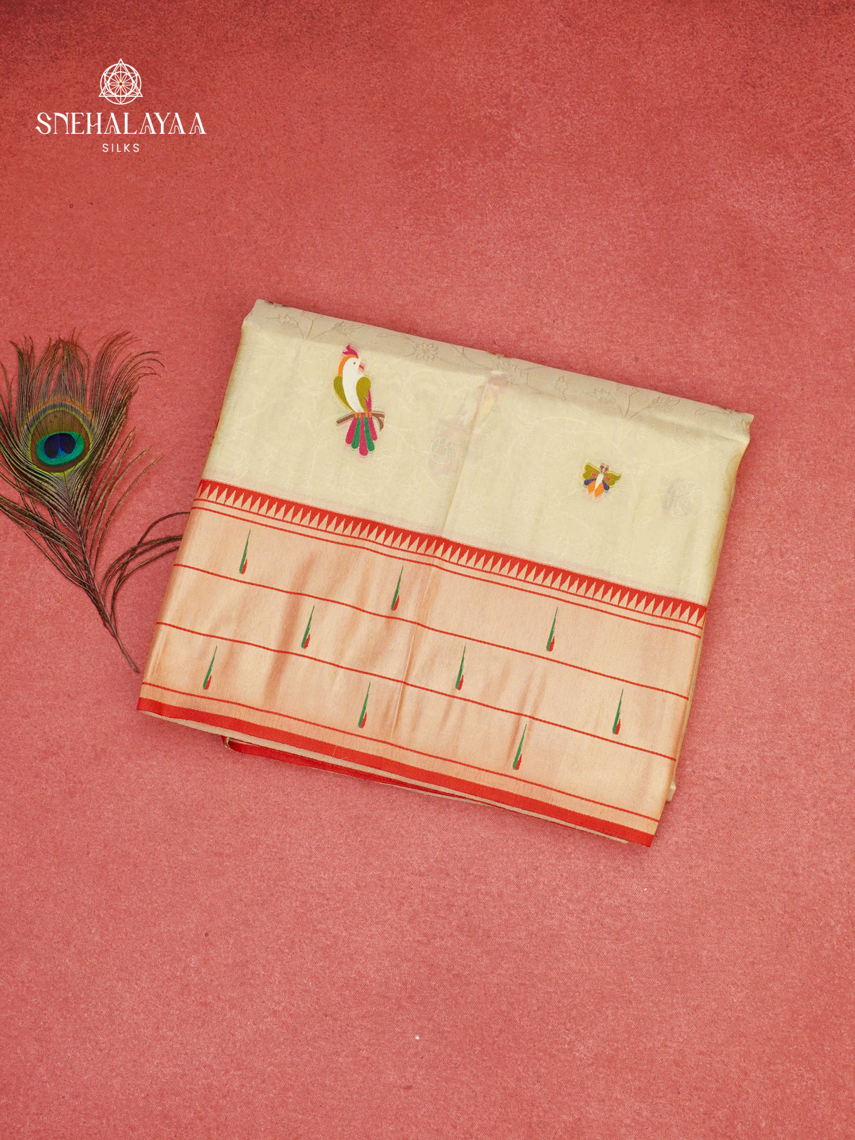 Banaras tissue Paithani design blends the sheer, lustrous elegance of Banarasi tissue fabric with traditional Paithani motifs and rich zari work. It creates a lightweight yet regal look, perfect for festive and ceremonial wear.