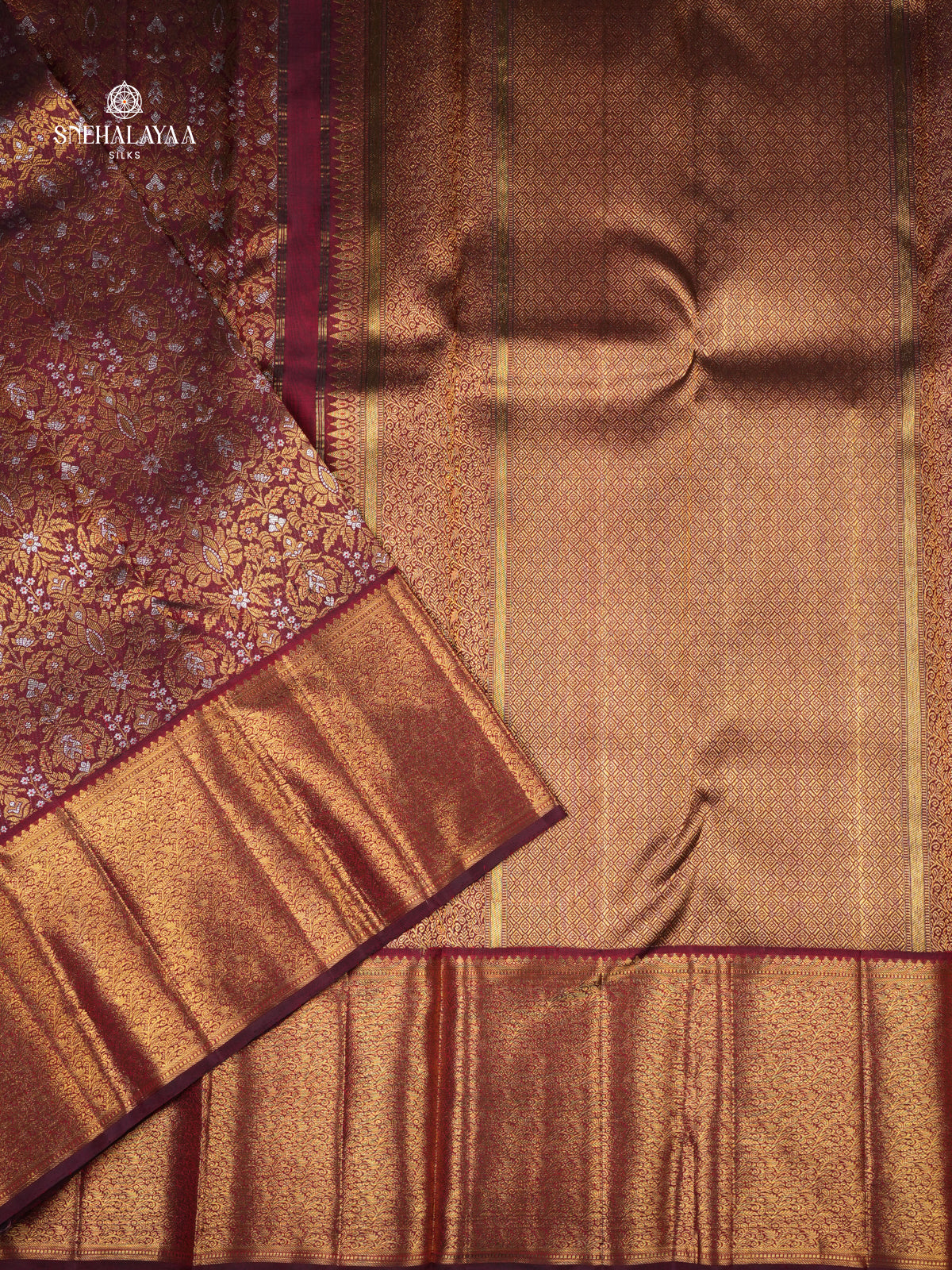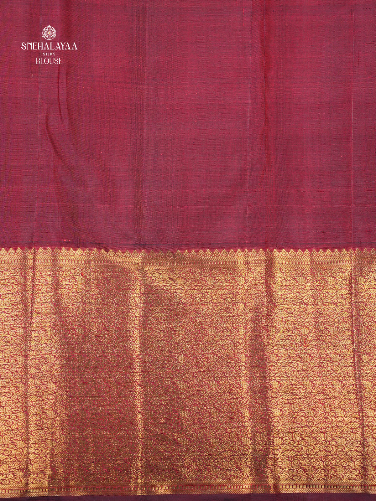 A timeless Kanjivaram silk saree adorned with a traditional floral design woven across the body, beautifully finished with classic antique gold zari borders. Crafted in pure silk with rich zari detailing, this saree is Silk Mark Certified, ensuring genuine quality and authenticity.