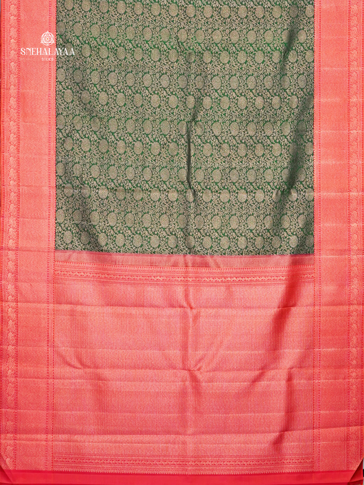 This Kanjivaram Silk Saree features intricate floral zari vines across the body and a contrasting antique gold border adorned with traditional elephant and peacock motifs. Silk Mark Certified for guaranteed purity, this timeless masterpiece combines rich heritage with premium craftsmanship.