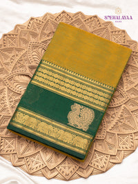 Chettinad cotton sarees are known for their bold, vibrant colors and traditional design. Woven with thick, high quality cotton, they are durable and comfortable, featuring contrasting borders with peacock and rudraksham motif.