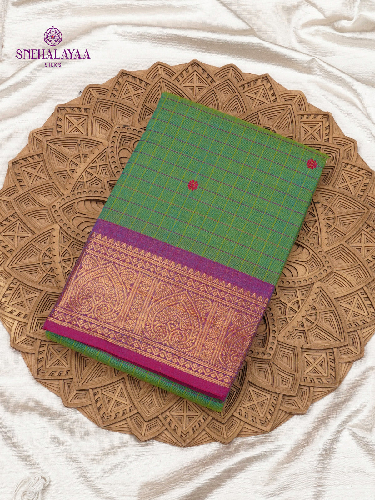 Muted green body with fine yellow checks and small maroon buttas, paired with a rich purple border woven in gold zari paisley motifs. Classic Chettinad cotton with a bold, elegant contrast.