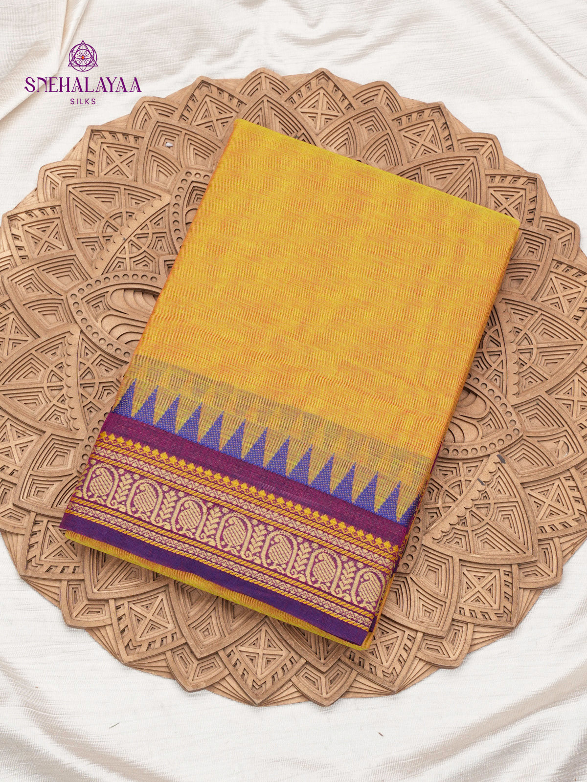 Handwoven Chettinad cotton saree in a rich mustard yellow body, highlighted with a deep purple zari border and traditional temple motifs. Lightweight, breathable cotton with a classic handloom texture, designed for everyday comfort and timeless appeal.