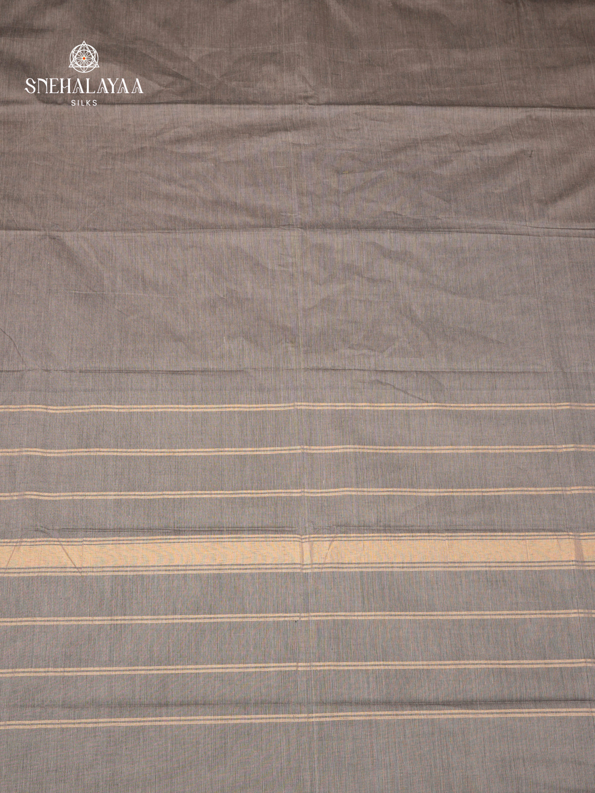 Handwoven Chettinad cotton saree in a refined steel grey body, finished with a rich wine zari border featuring classic round motifs. Lightweight, breathable, and rooted in traditional handloom craft.