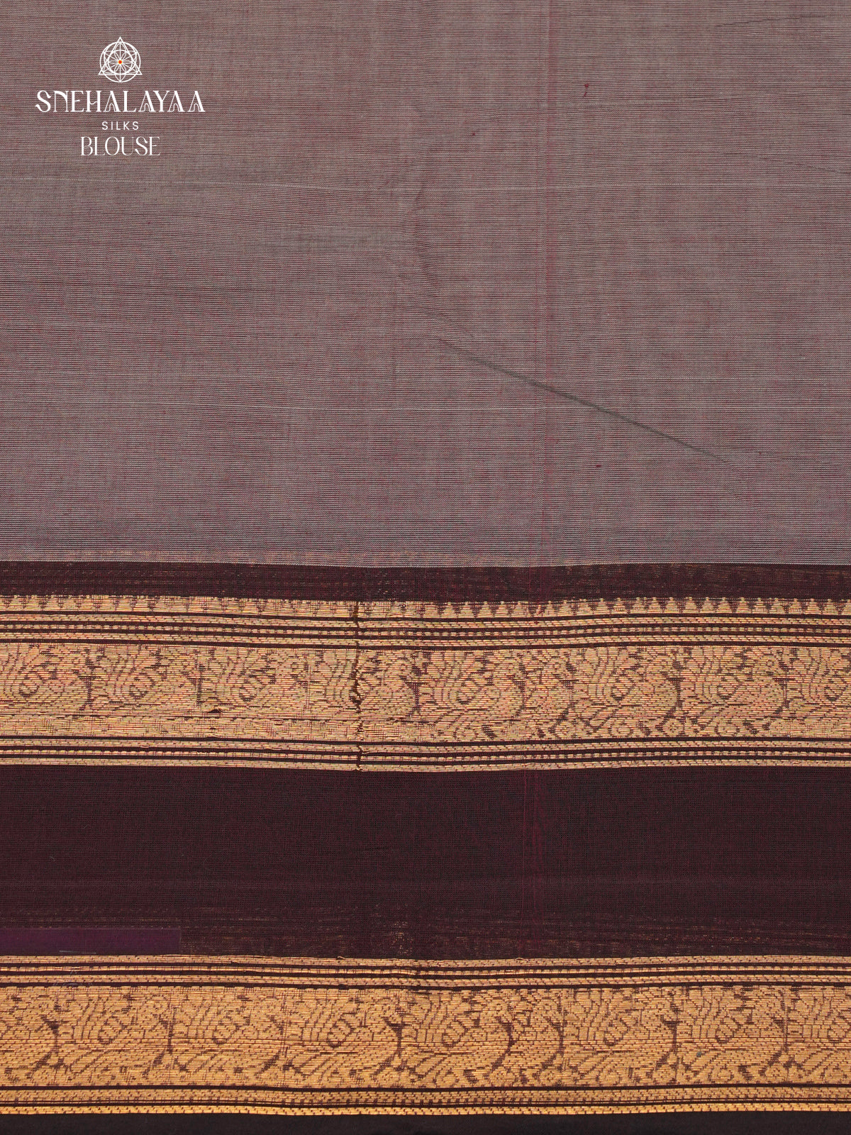 Handwoven Chettinad cotton saree in a deep charcoal grey body, enhanced with an antique gold zari border featuring classic floral patterns. Lightweight, breathable, and understatedly elegant.