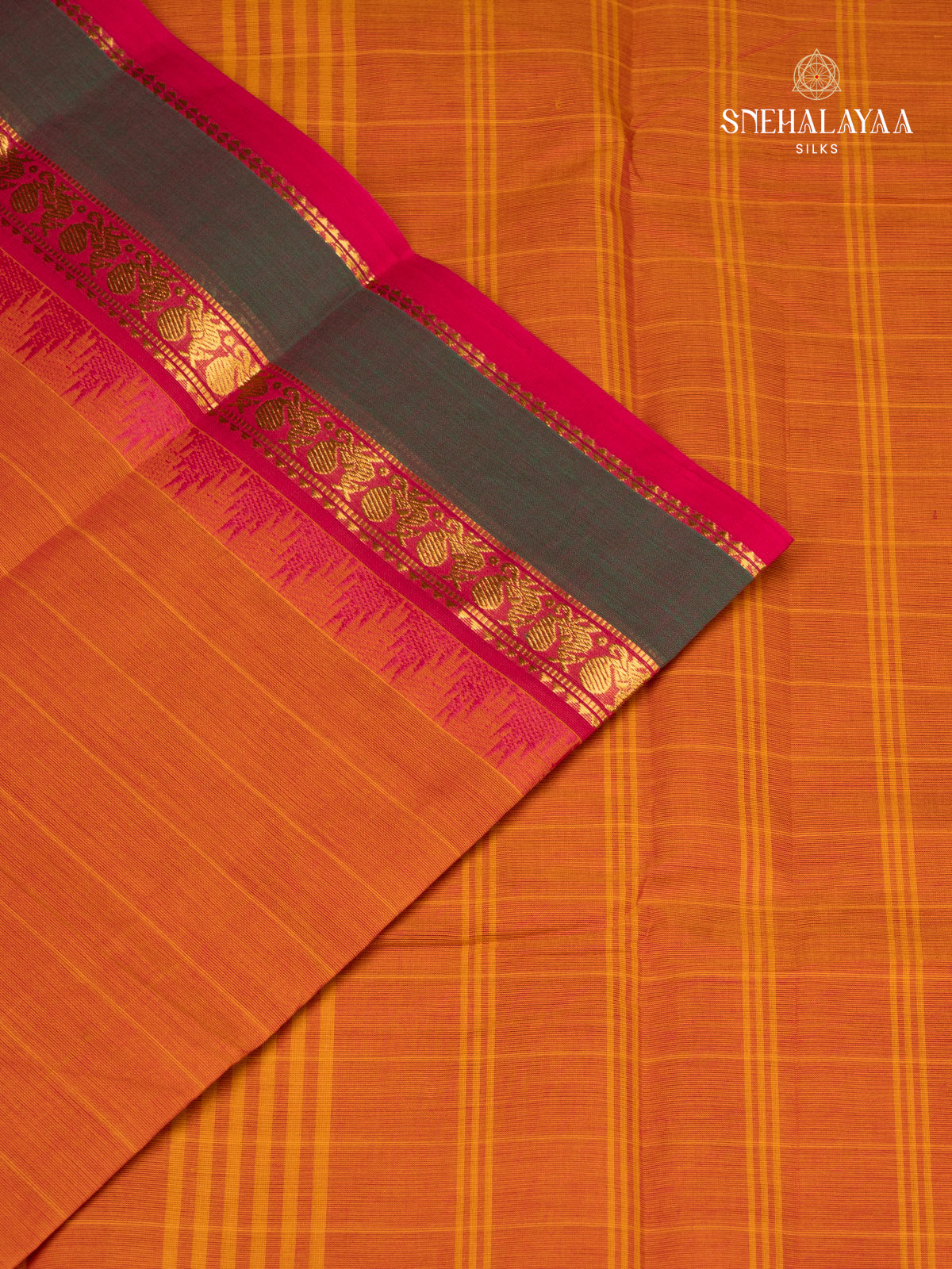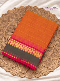 Chettinad cotton sarees are renowned for their bold, geometric patterns and stripes. They often feature vibrant, contrasting colors in wide checks, stripes, or block prints.