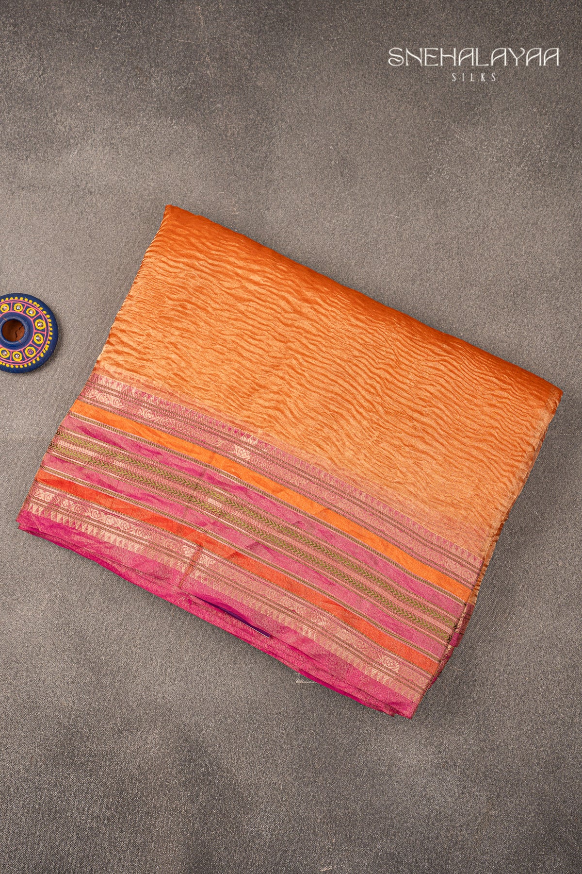 This orange crush tissue saree is a vibrant, stylish choice with a unique texture that sets it apart. The crush tissue fabric has a naturally crinkled or crushed appearance, giving the saree added depth and a contemporary, playful look.