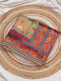 A Banarasi saree adorned with intricate pichwai prints and a delicate floral border, exuding traditional elegance. The vibrant, colorful pallu adds a striking contrast, making it a perfect blend of artistry and grace.