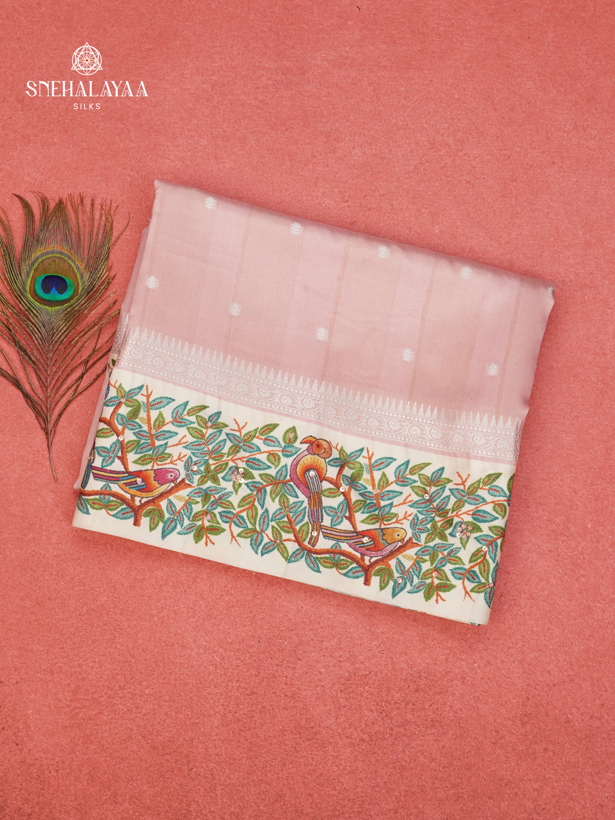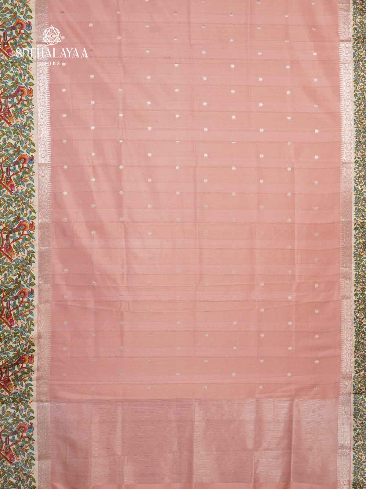 A Banaras dola silk saree features a lightweight, flowing drape with a refined natural sheen. Its traditional Banarasi weaving adds a touch of timeless elegance and grace.