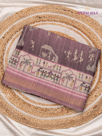 Elegantly crafted Dola saree featuring intricate designs running throughout the body, complemented by a contrast pallu and blouse for a timeless appeal