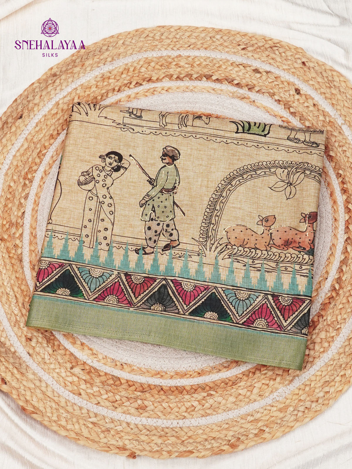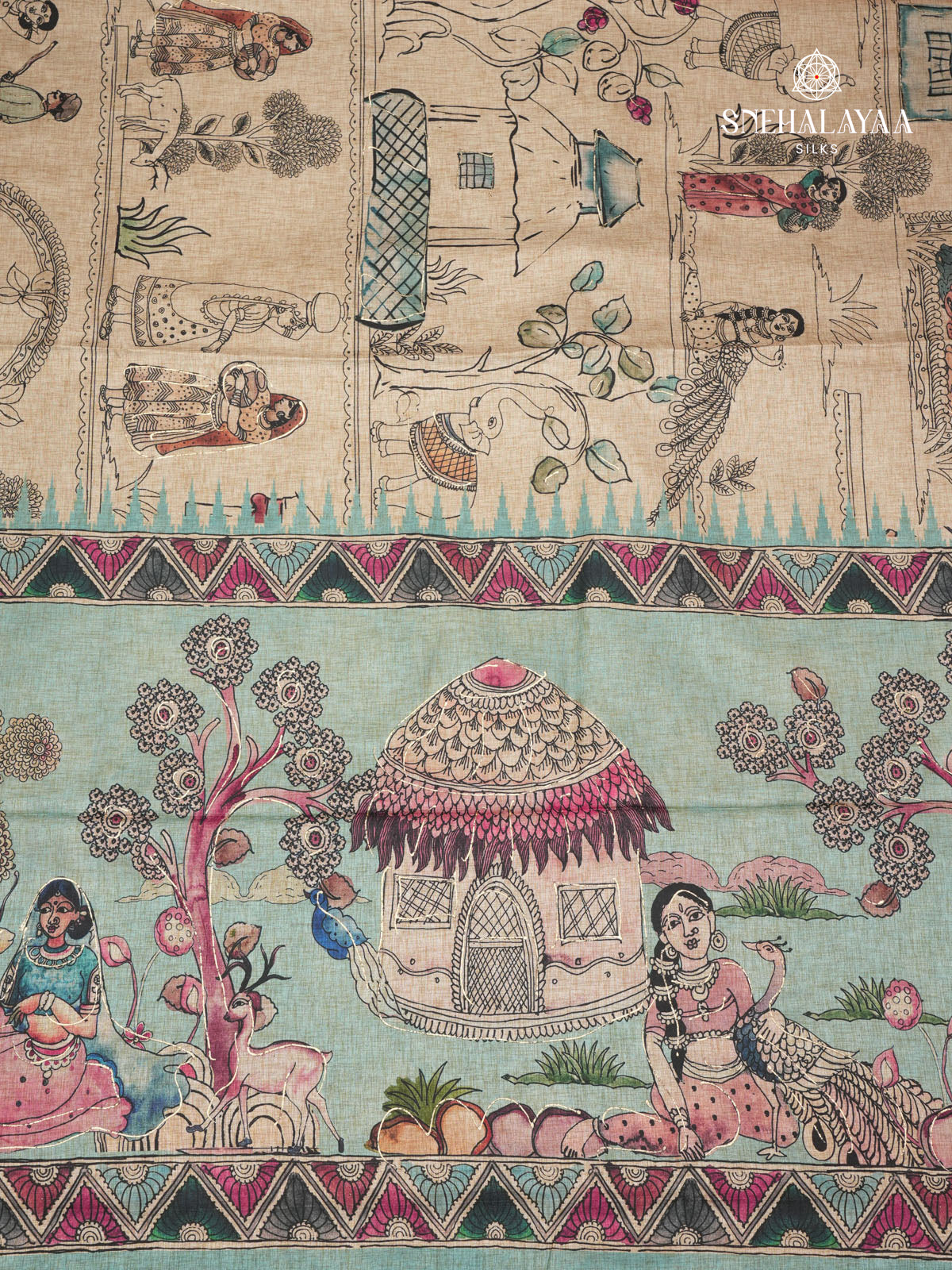 Beige With Teal Blue Border Floral Printed Tussar Saree