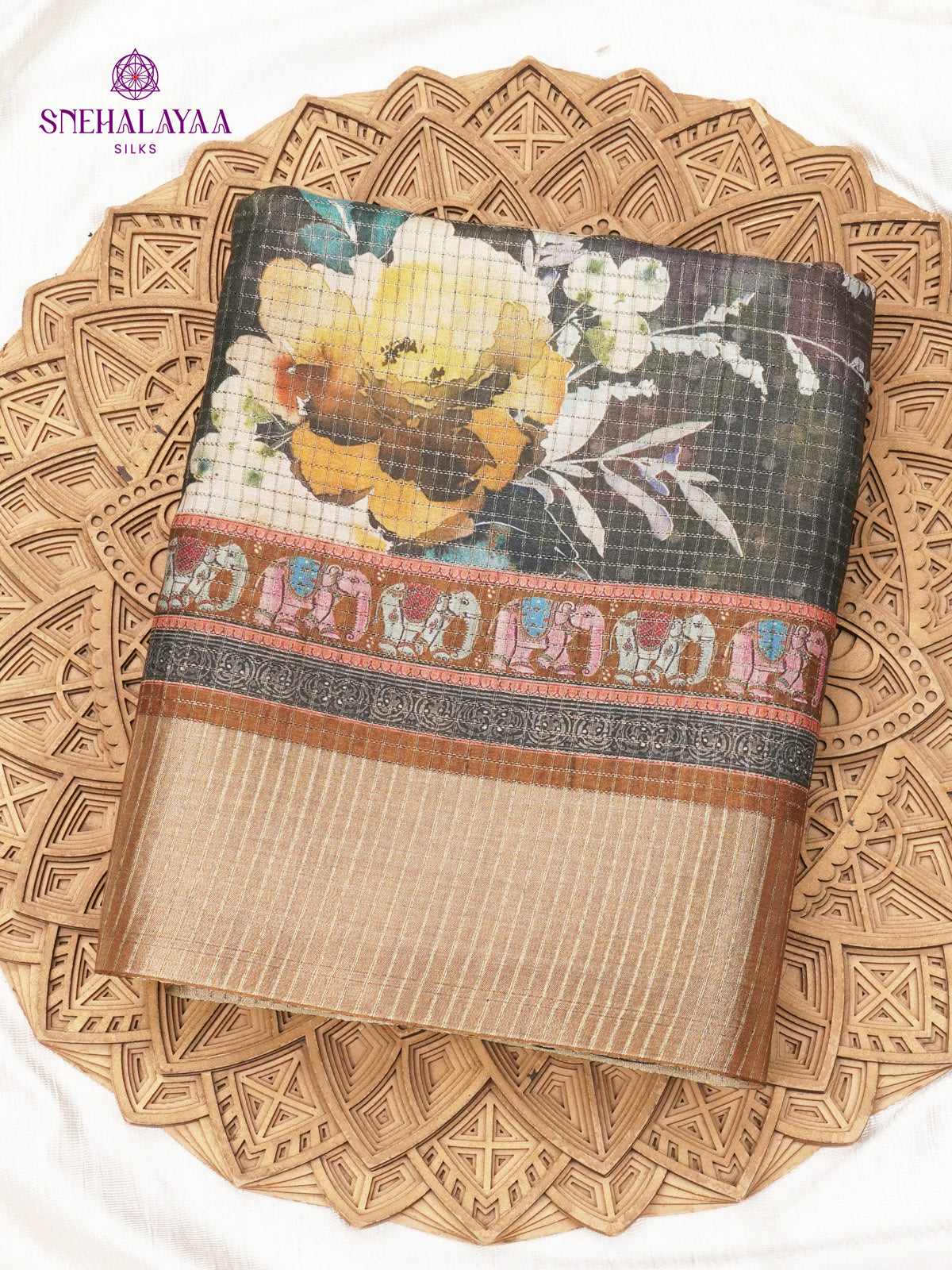Beautifully printed Tussar with blooming floral patterns that stand out. Its subtle sheen and breathable feel make it a versatile wardrobe favorite.
