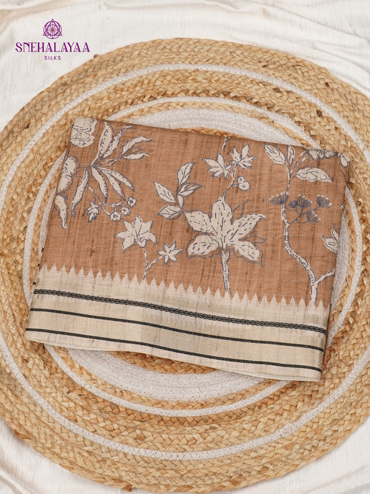 Brown Floral Printed Tussar Saree