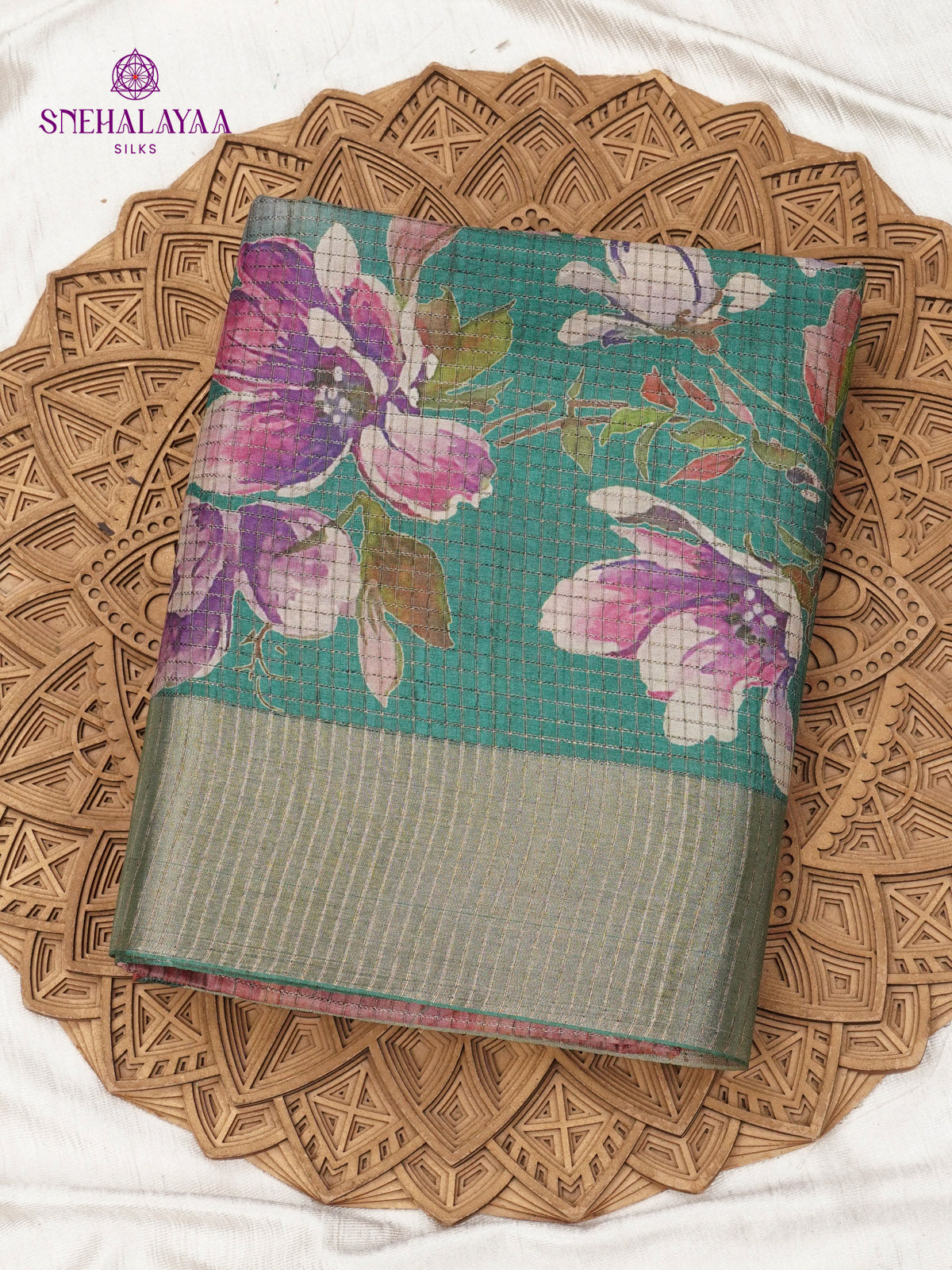 Magenta with Teal Blue Floral Printed Tussar Saree