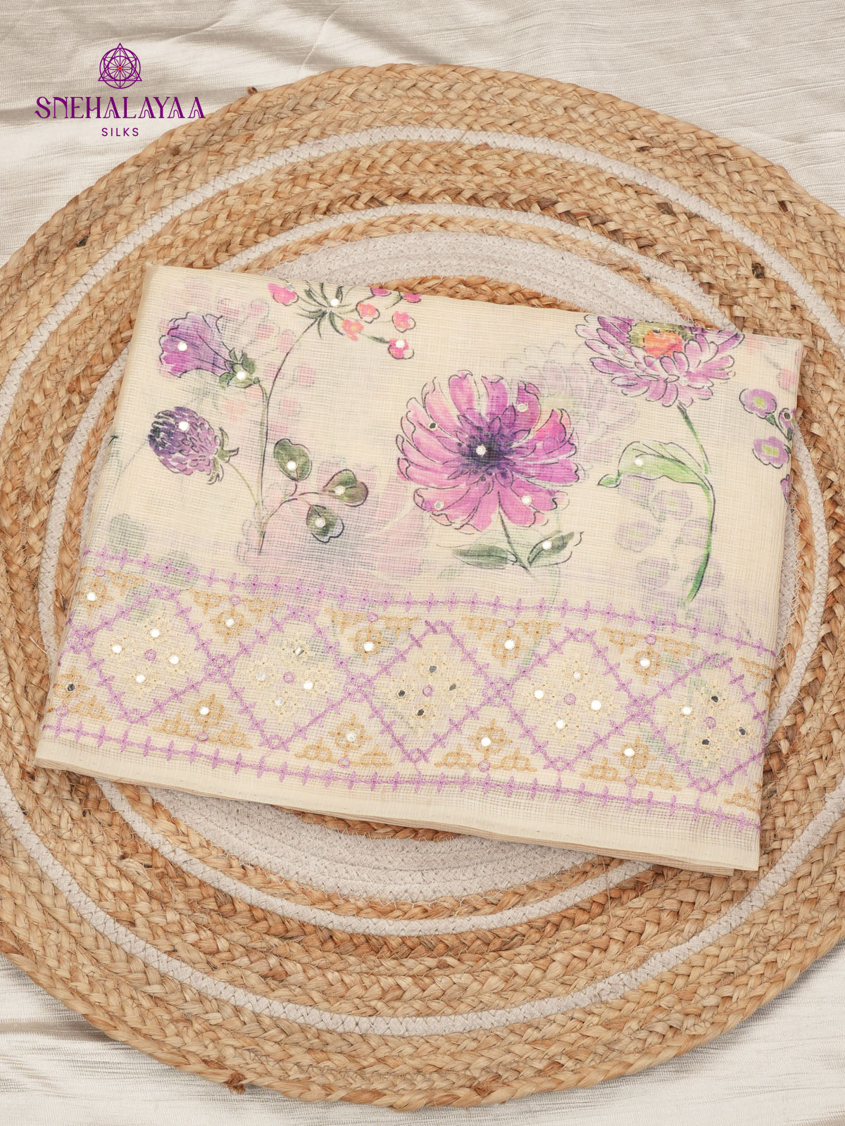 A Kota embroidery saree blends lightweight, airy kota doria fabric with intricate threadwork for an elegant, refined look. Its delicate texture and detailed motifs make it perfect for festive and everyday graceful wear.