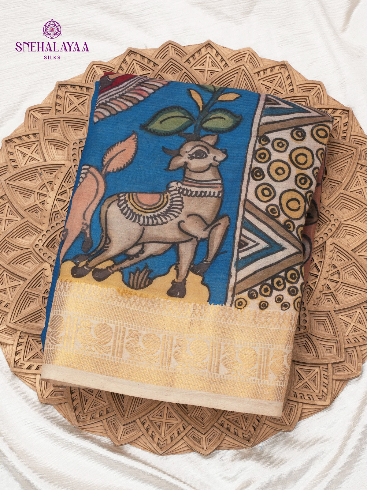 Pure Kalamkari hand-painted saree showcasing intricate traditional motifs crafted by skilled artisans. Made from natural fabrics and dyes, it reflects timeless artistry and cultural elegance.