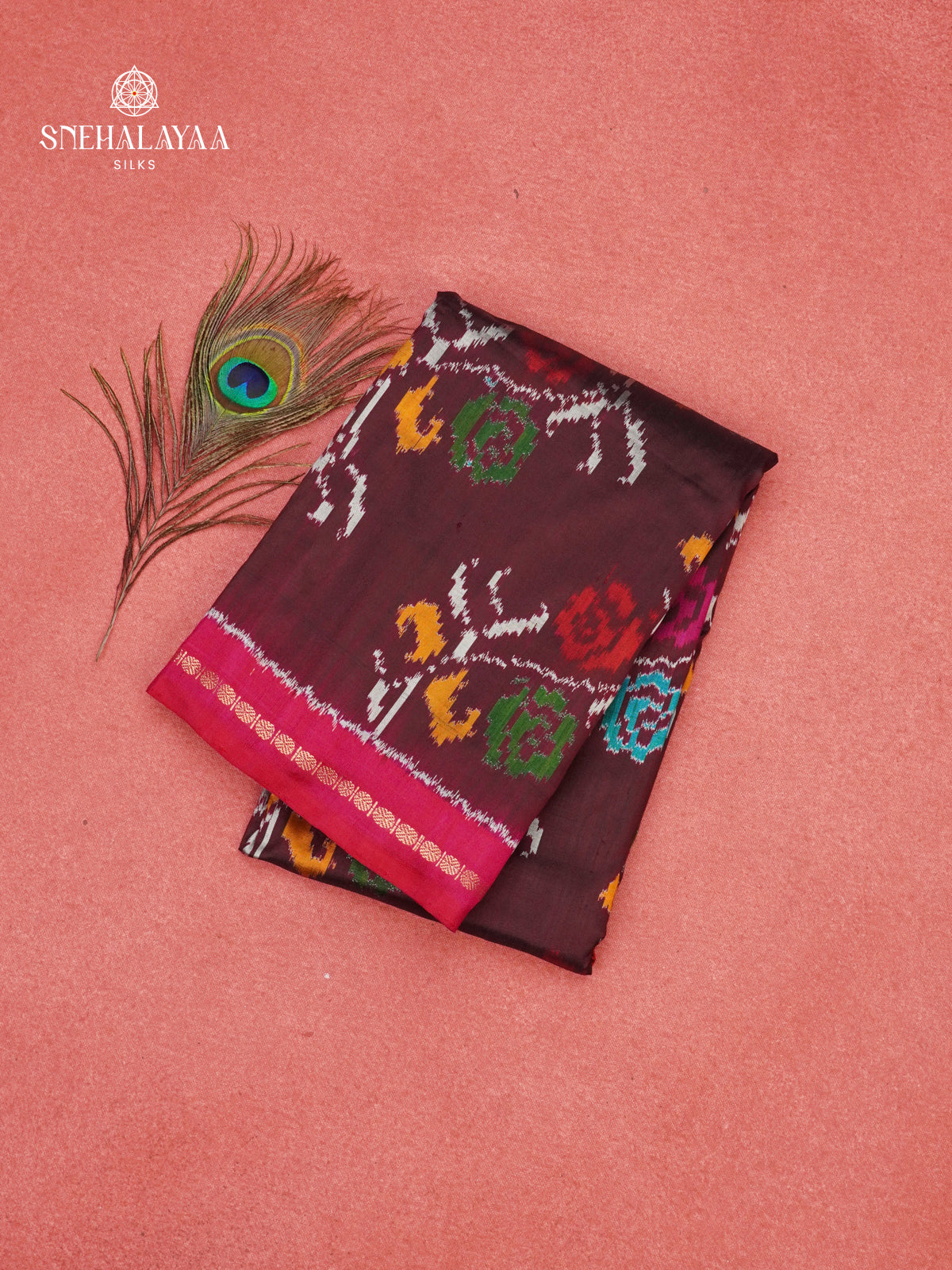Gracefully handwoven Ikat Silk Saree featuring a striking contrast border and pallu a perfect blend of tradition and style