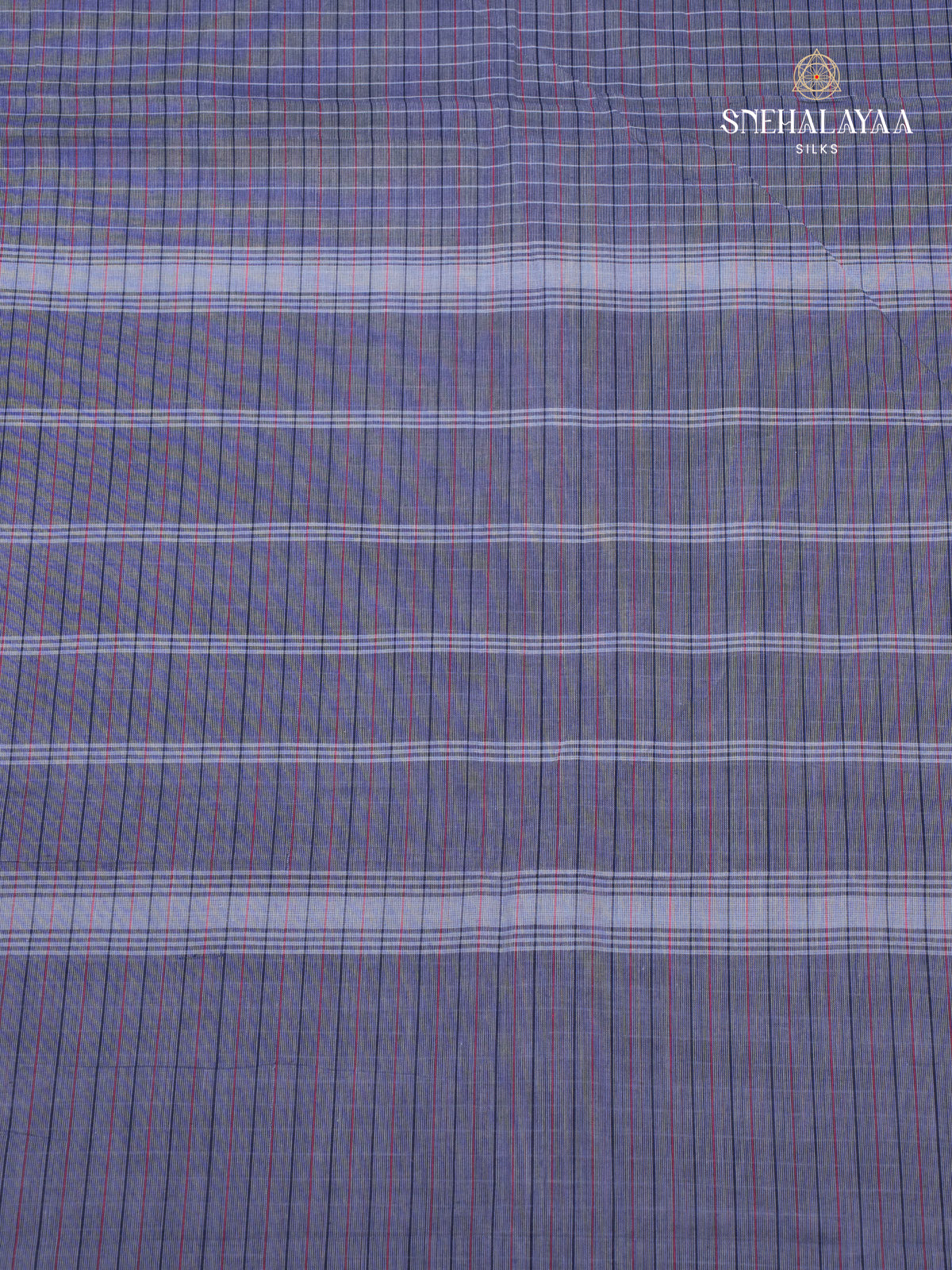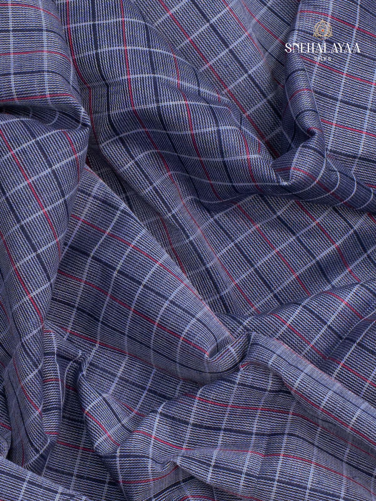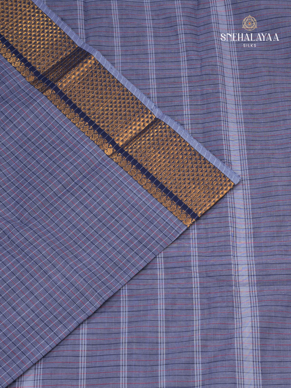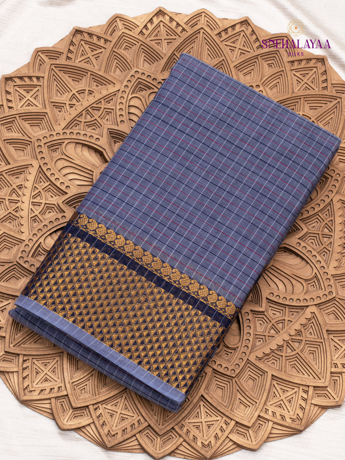 Charming kanchi cotton saree in a soft greyish-blue shade, highlighted with fine check patterns and a striking golden zari woven border, blending tradition with elegance for timeless appeal.