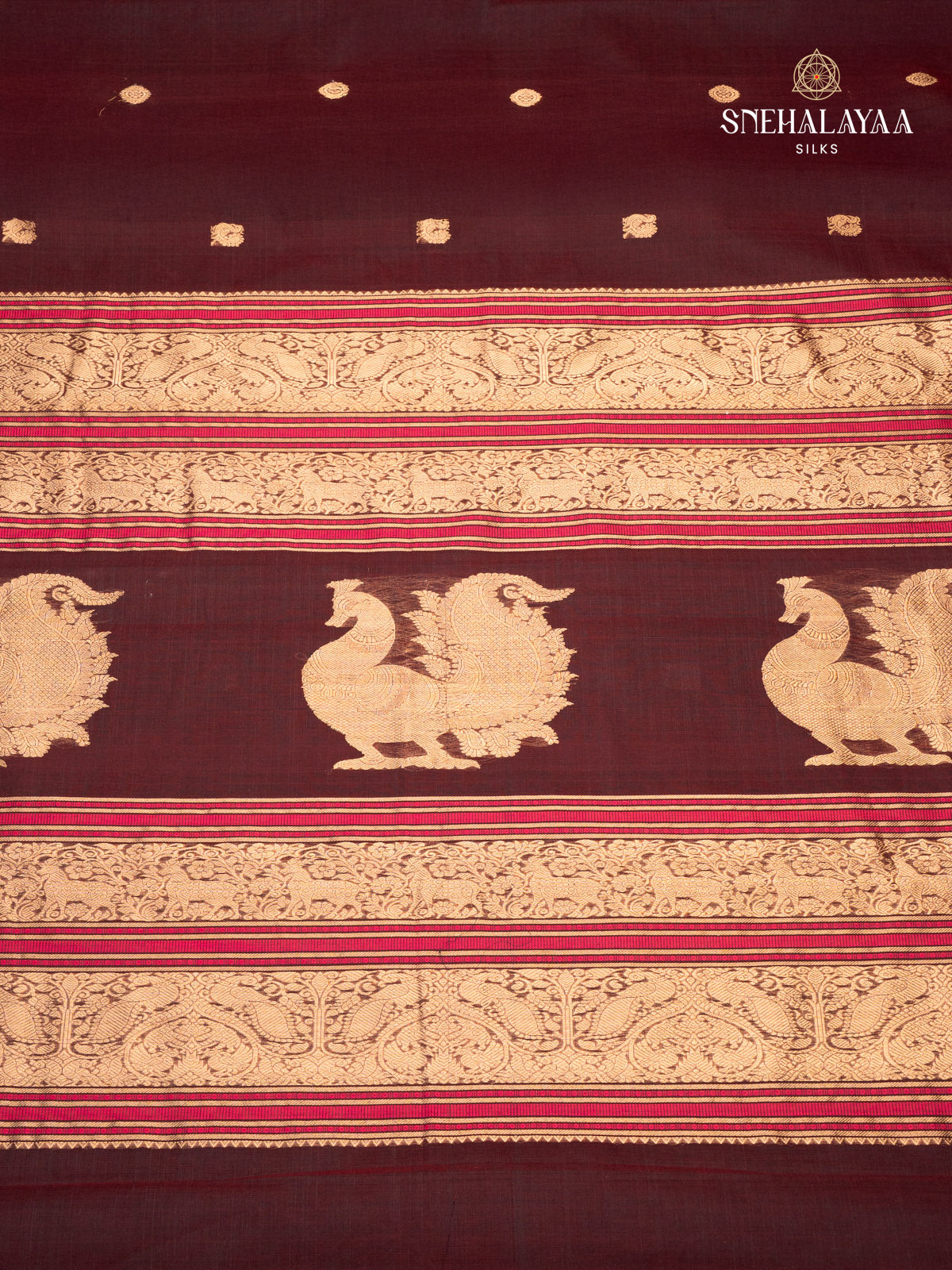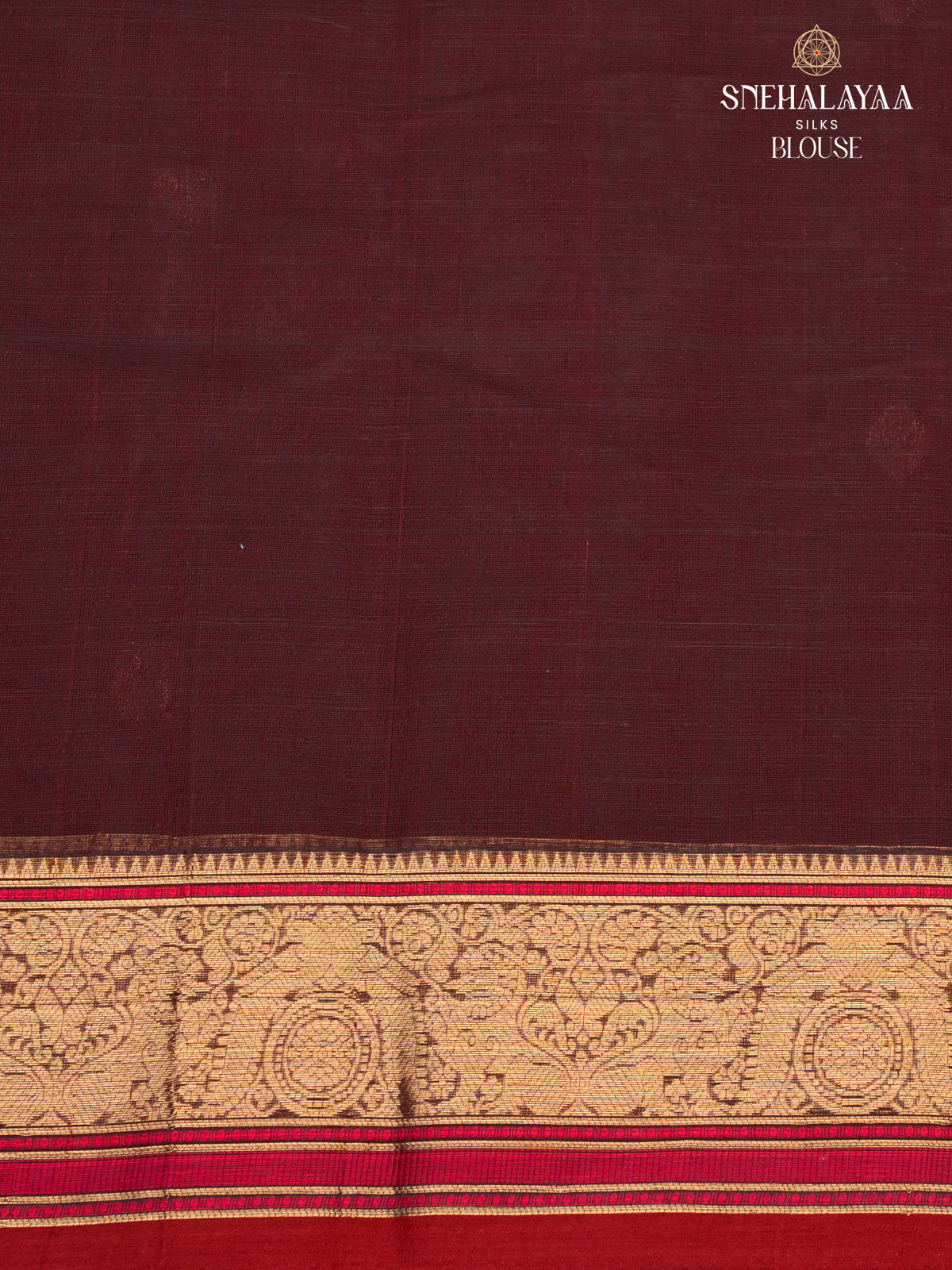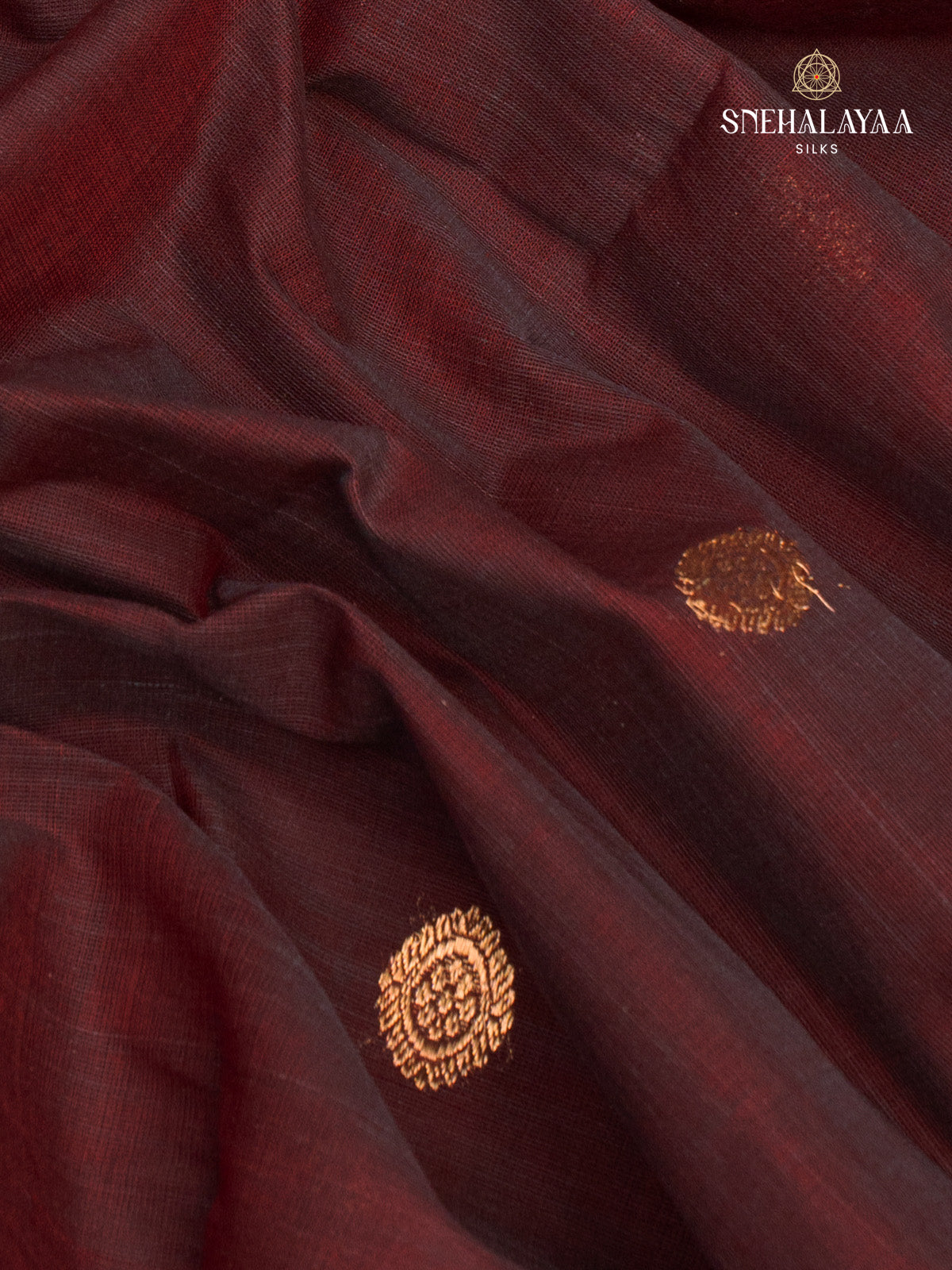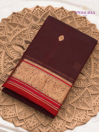 Kanchi cotton saree in deep maroon with a vibrant gold zari and red temple border. A traditional and comfortable South Indian handloom classic.