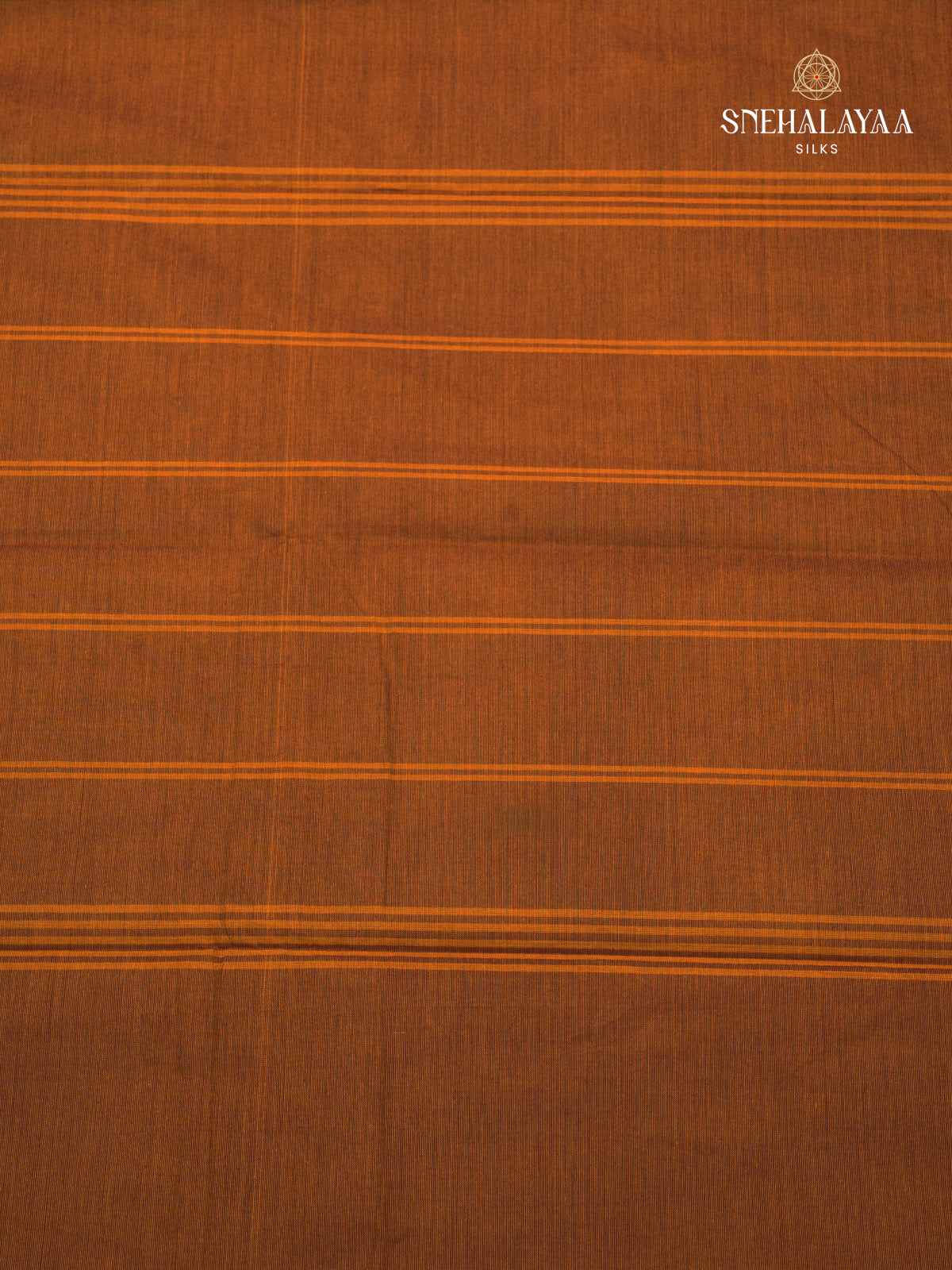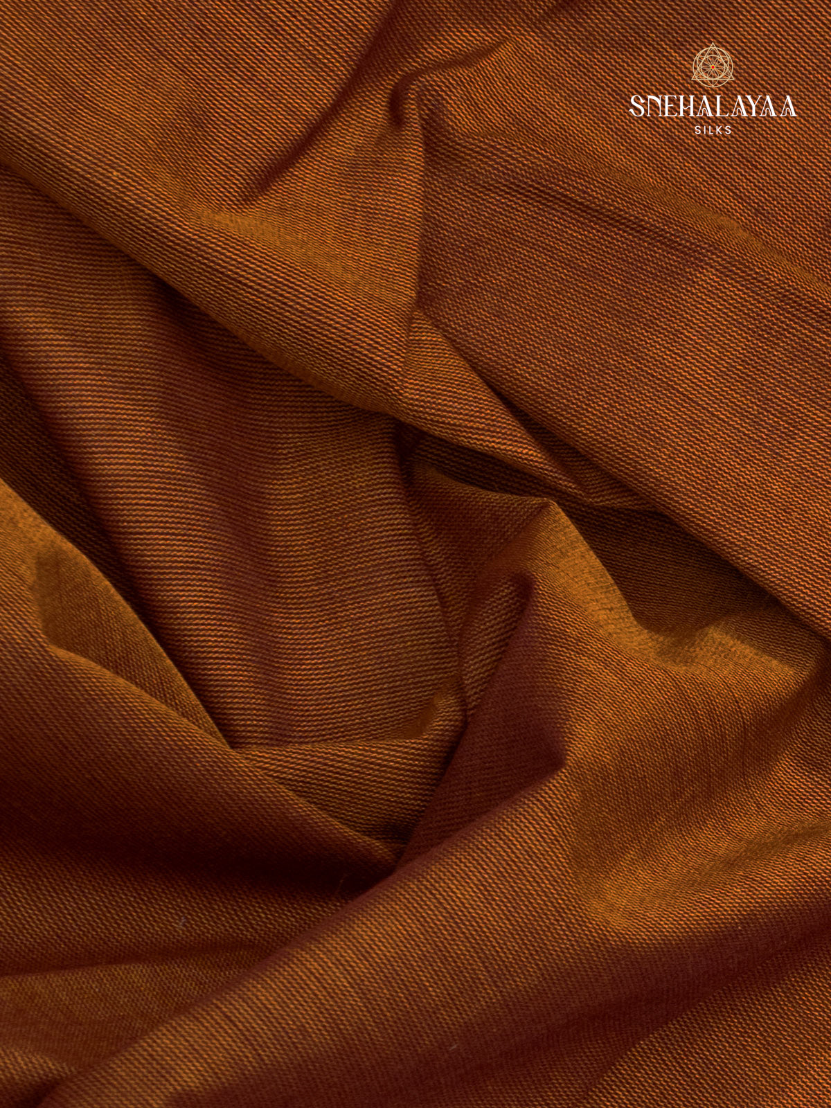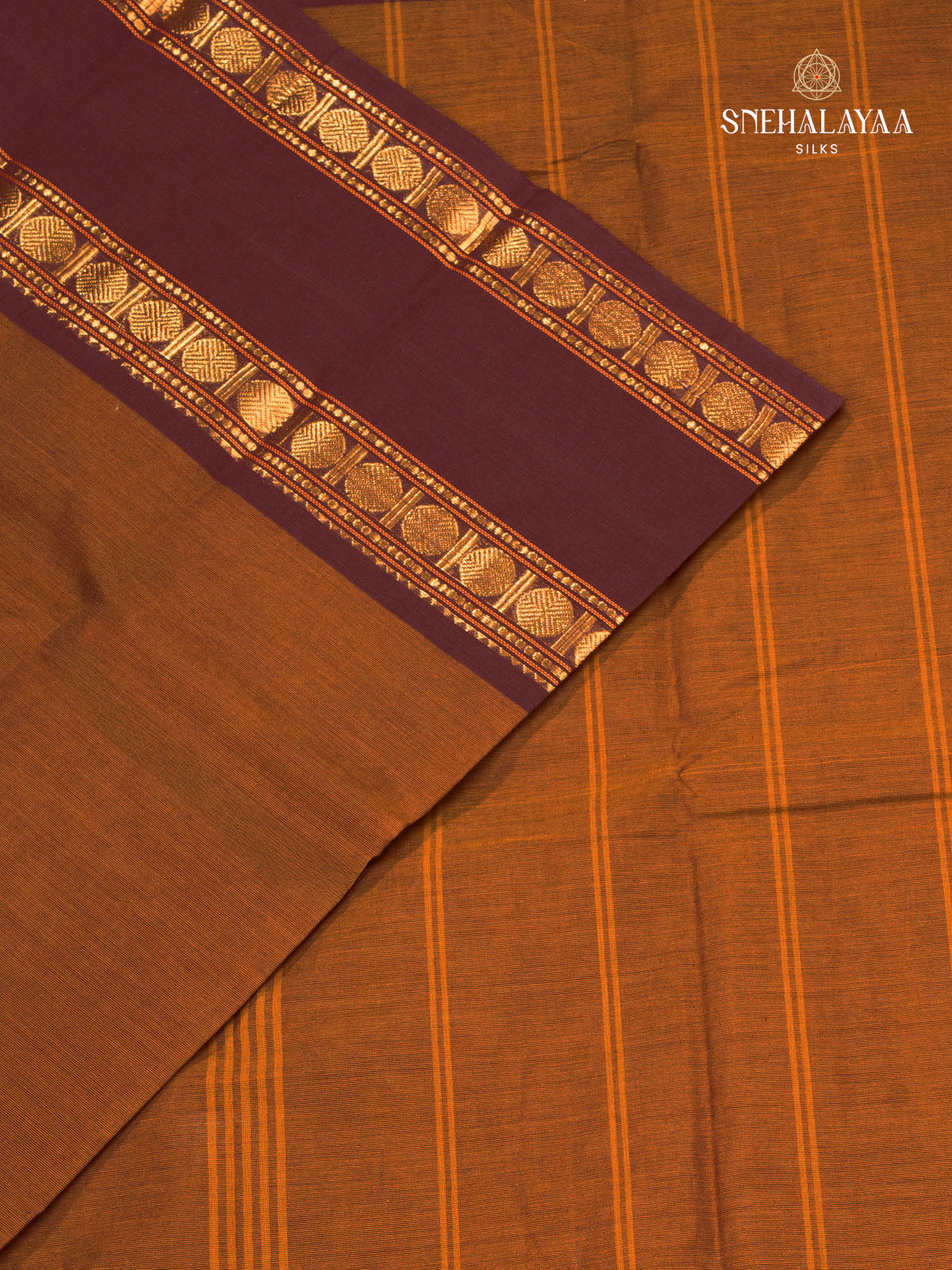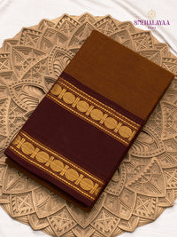 A elegant kanchi cotton saree featuring a rich brown body. The saree is finished with a wide, contrasting deep maroon border adorned with intricate, traditional gold motifs, including circles and geometric patterns.