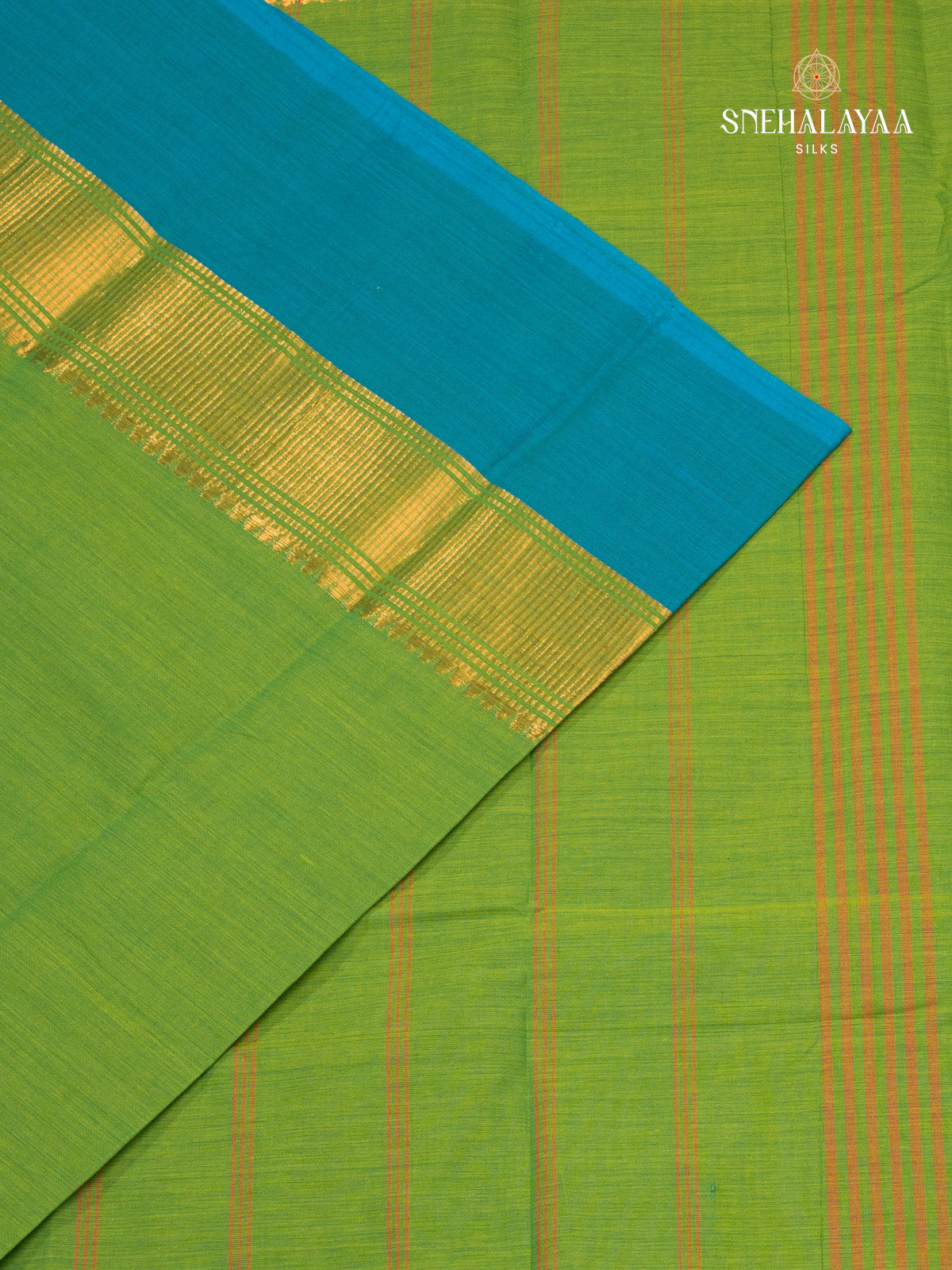 Elegant kanchi cotton saree with a light green body. The design is minimalist, with a central section featuring bands of golden yellow and teal, giving it a modern yet traditional look.