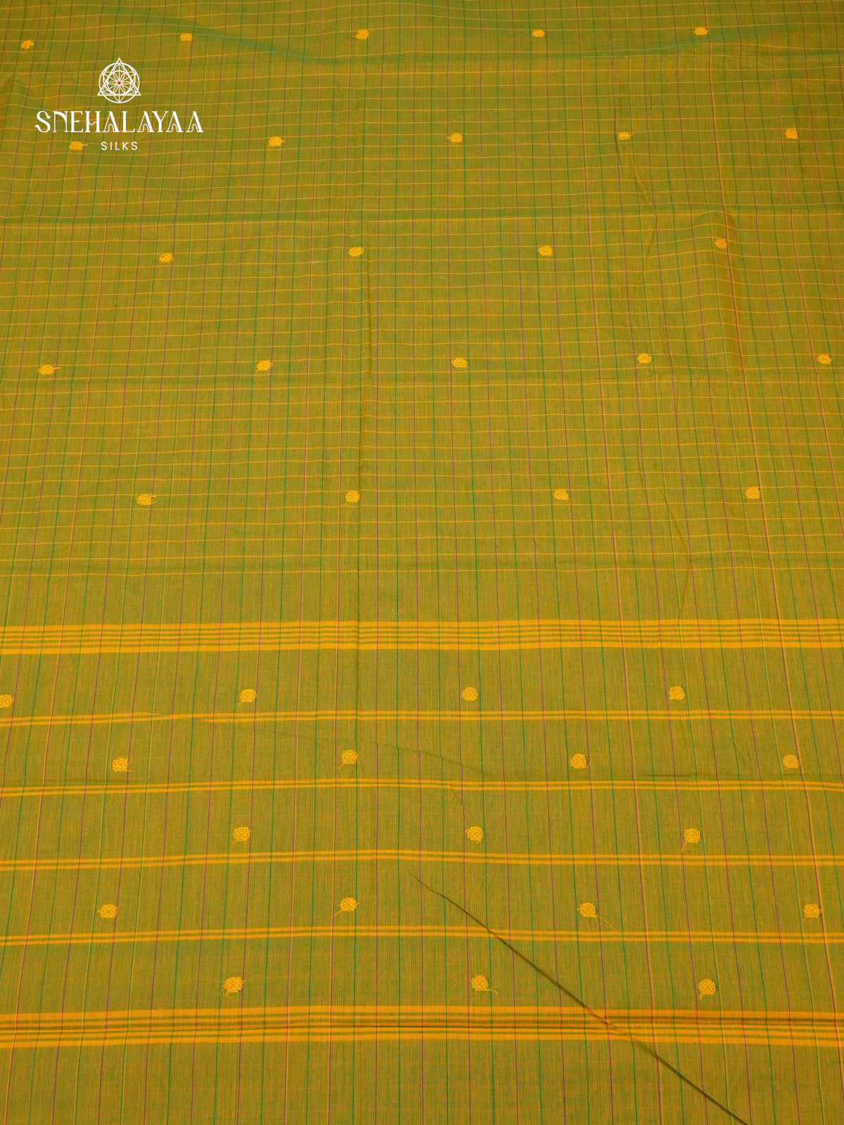 Authentic Kanchi cotton saree featuring a classic green checked body, finished with a contrasting zari border woven with traditional circular motifs, reflecting the timeless weaving style of South Indian cotton sarees.