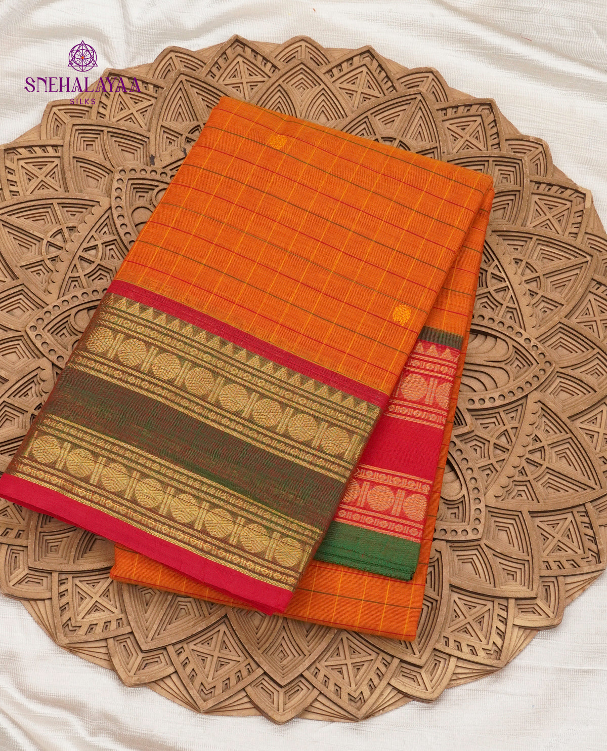 Authentic Kanchi cotton saree featuring a vibrant orange checked body, highlighted with contrasting irandu karai borders, woven with rich zari circular motifs that reflect the bold yet traditional character of South Indian cotton weaves.