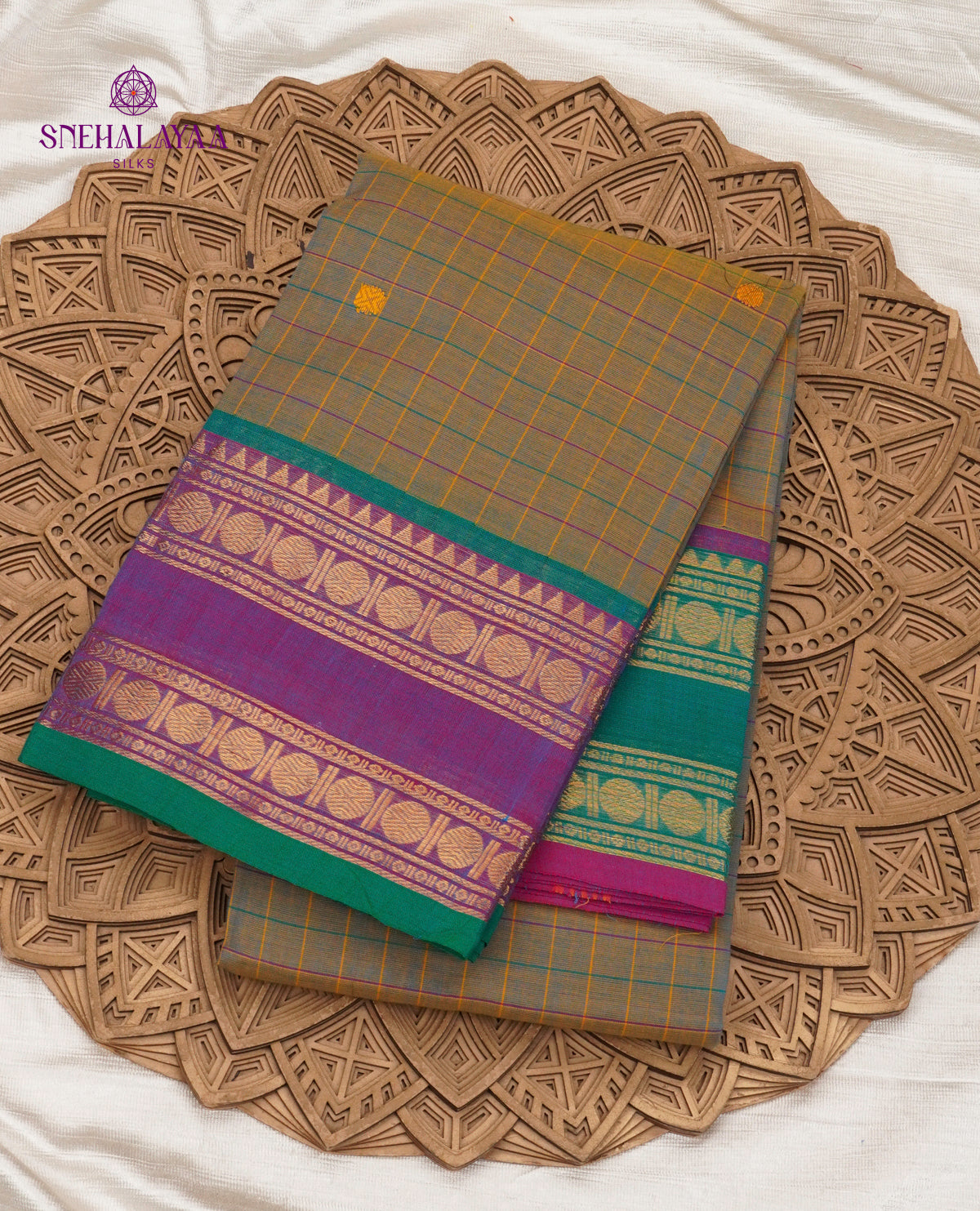 Authentic Kanchi cotton saree featuring a classic checked body, paired with contrasting irandu karai borders in rich zari work, showcasing traditional circular motifs and the timeless weaving character of South Indian cotton sarees.