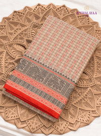 Classic kanchi cotton saree featuring a beige checkered body and a detailed grey and vibrant red border with traditional motifs.