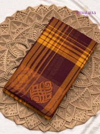 Elegant kanchi Cotton Saree in deep maroon with mustard checks, highlighted by traditional woven motifs on the pallu. A classic blend of comfort and tradition, perfect for festive occasions and cultural gatherings.