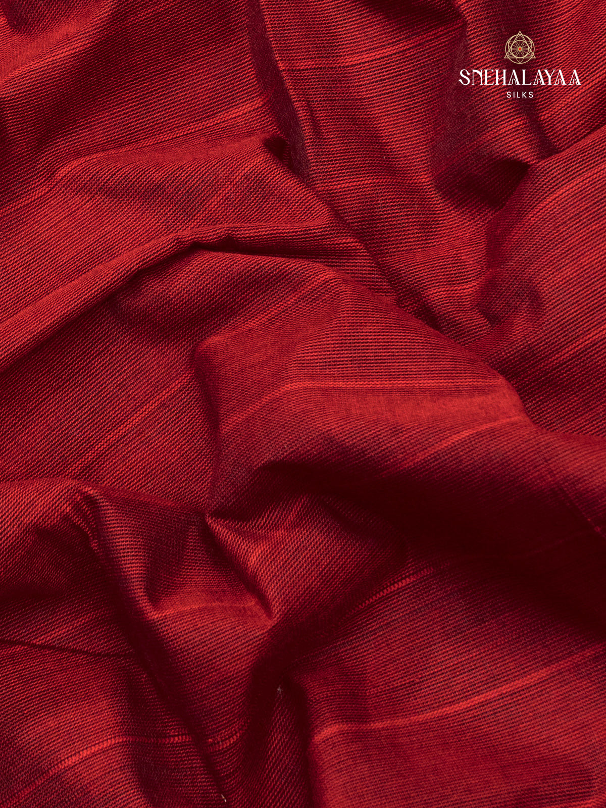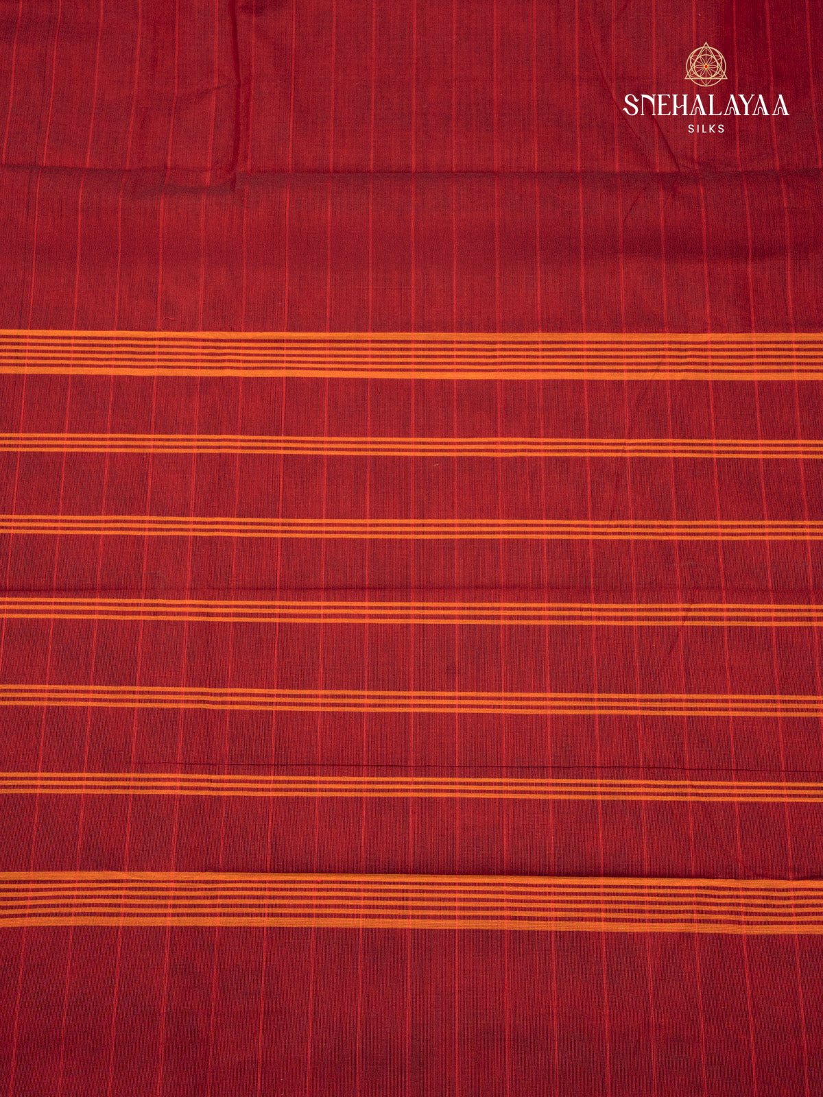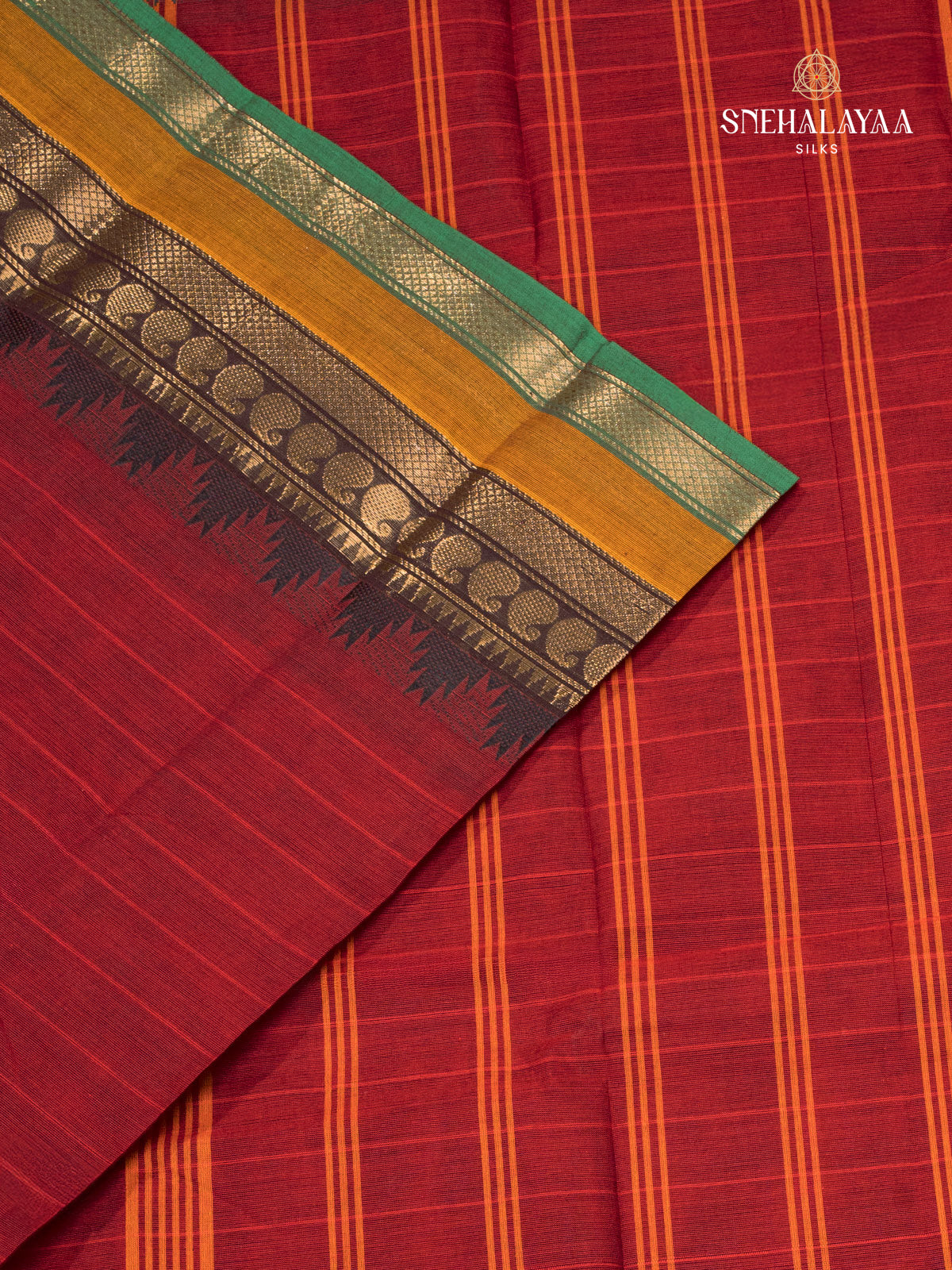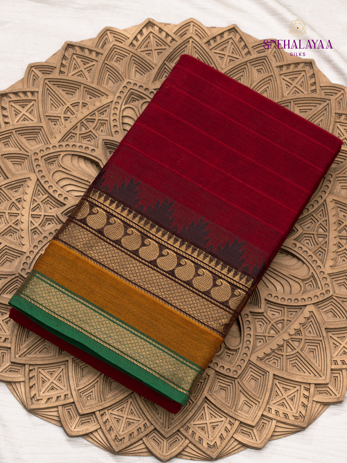 A rich kanchi cotton saree with a deep maroon body. The saree is finished with a wide, multi layered border featuring traditional patterns, including a line of intricate paisley and floral motifs in gold, all framed by a contrasting golden yellow and a deep green line.