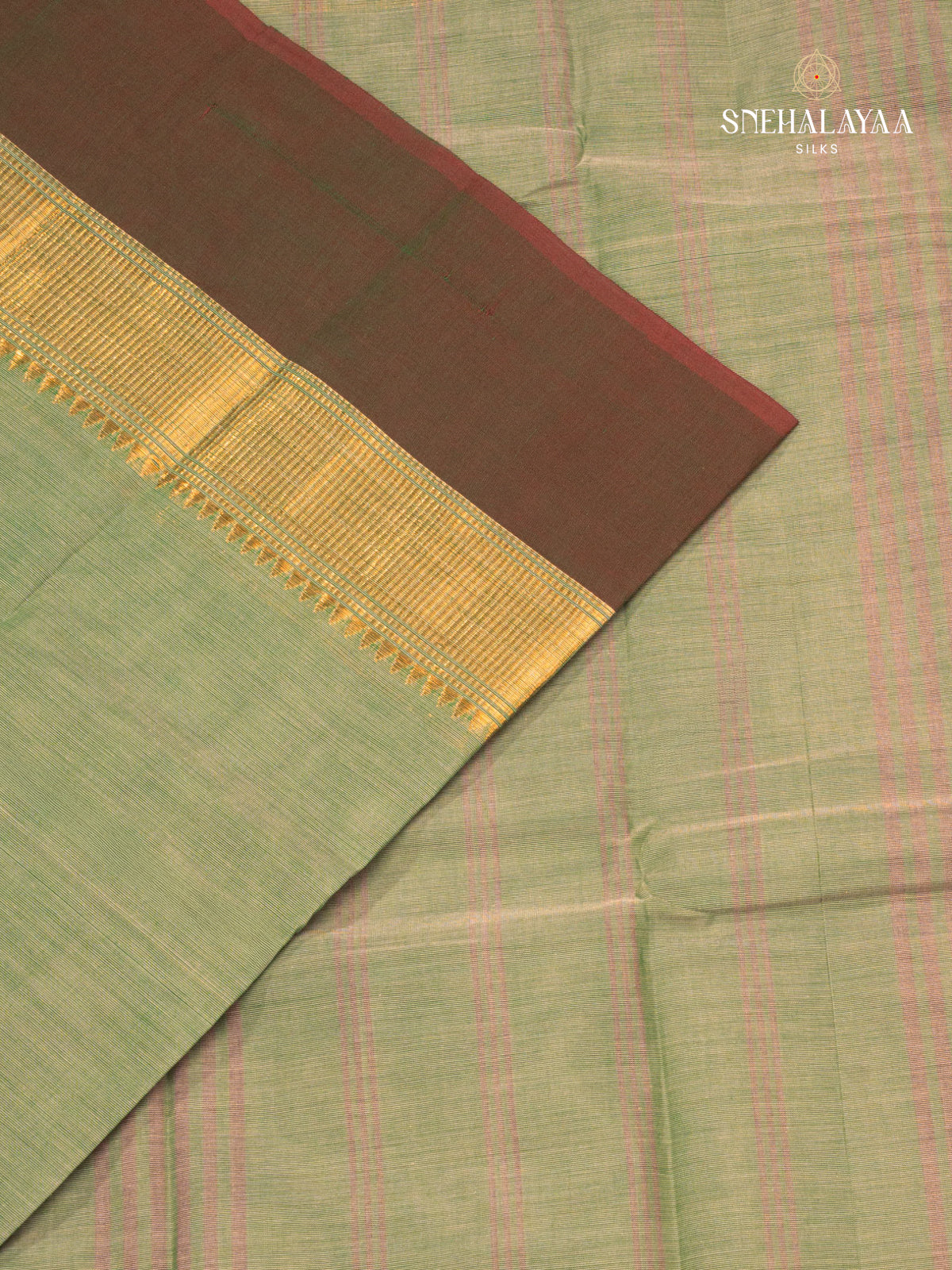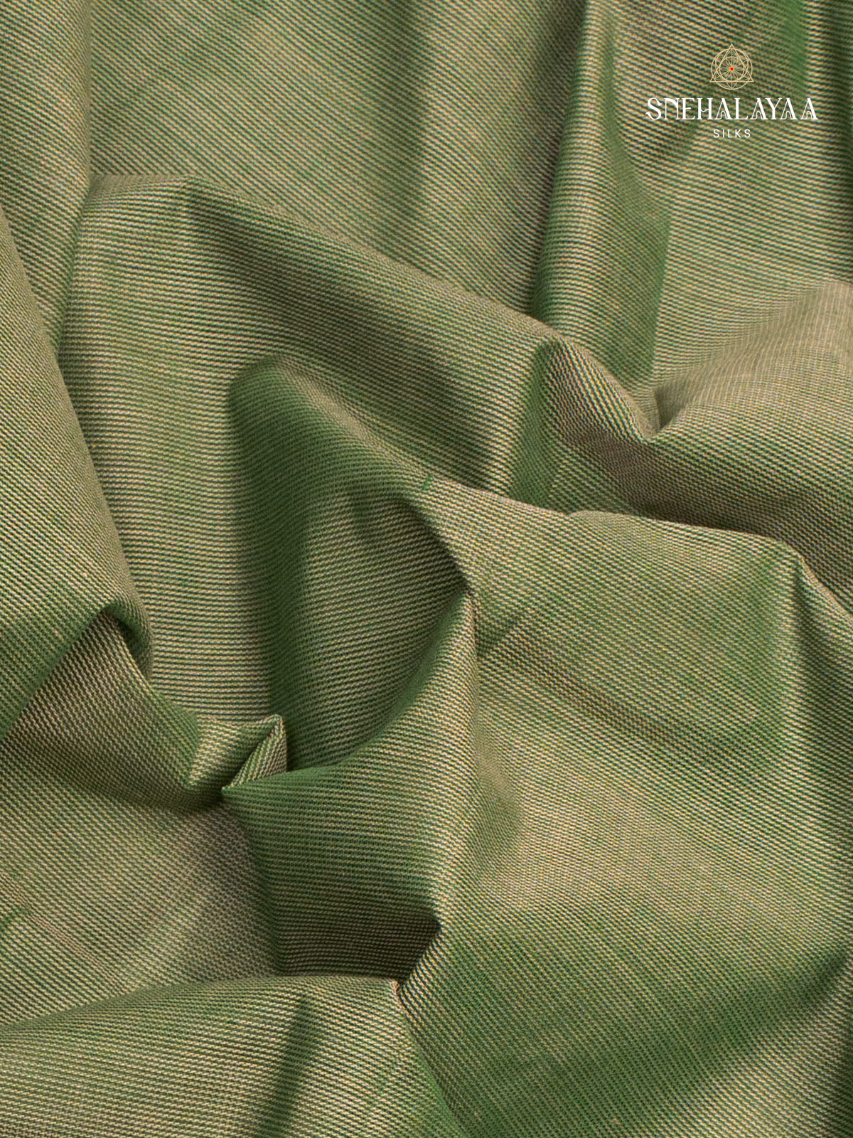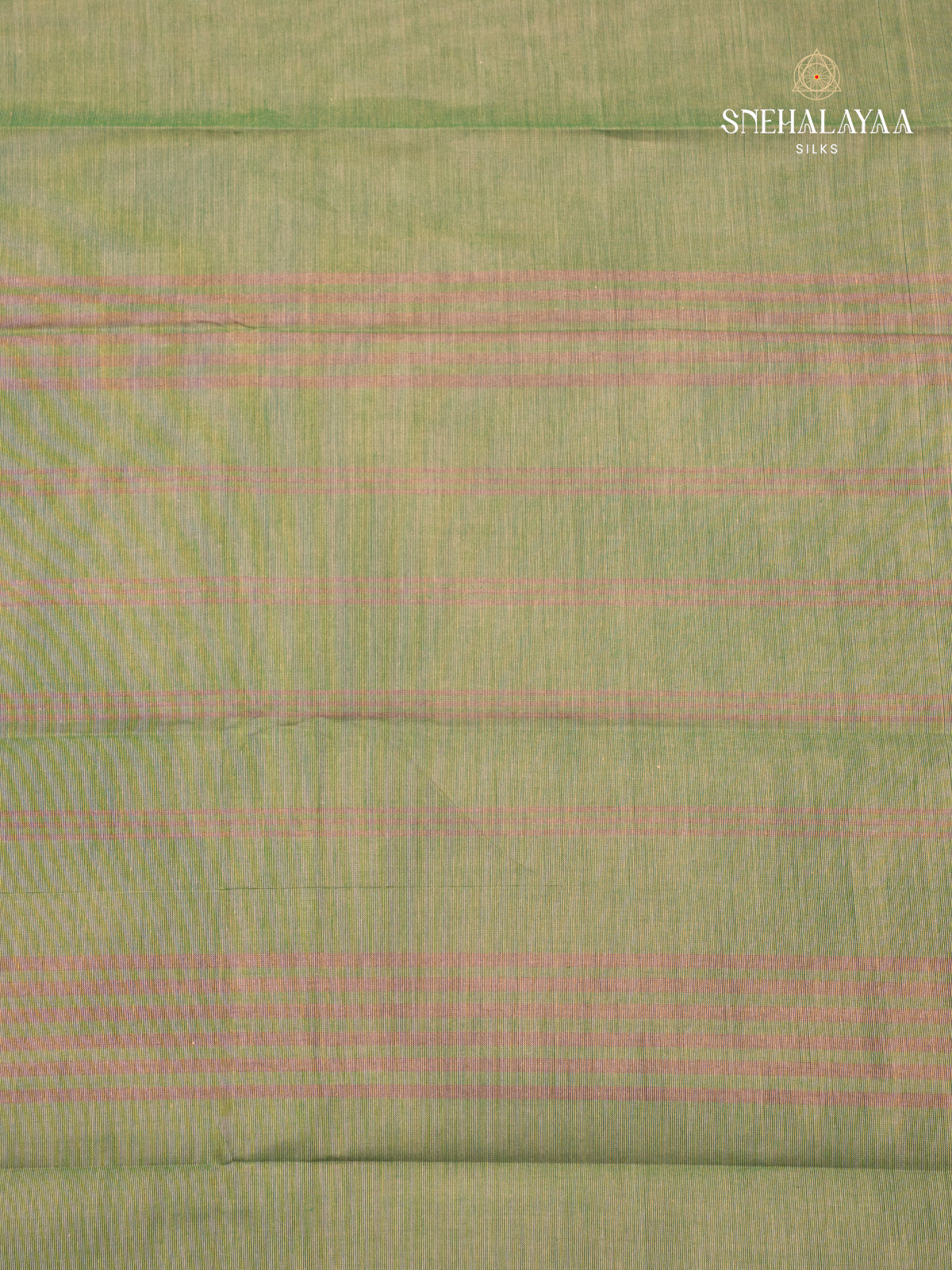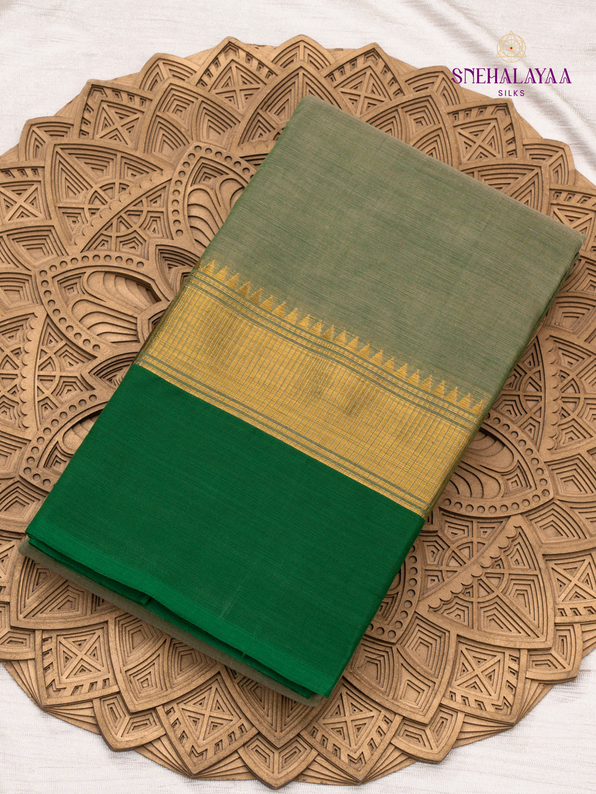 Elegant kanchi cotton saree in a dual tone design. The top half is a subtle, light olive green, while the bottom half and pallu are a rich, forest green. The two colors are separated by a central band of golden yellow with fine temple-like motifs, adding a touch of traditional artistry.