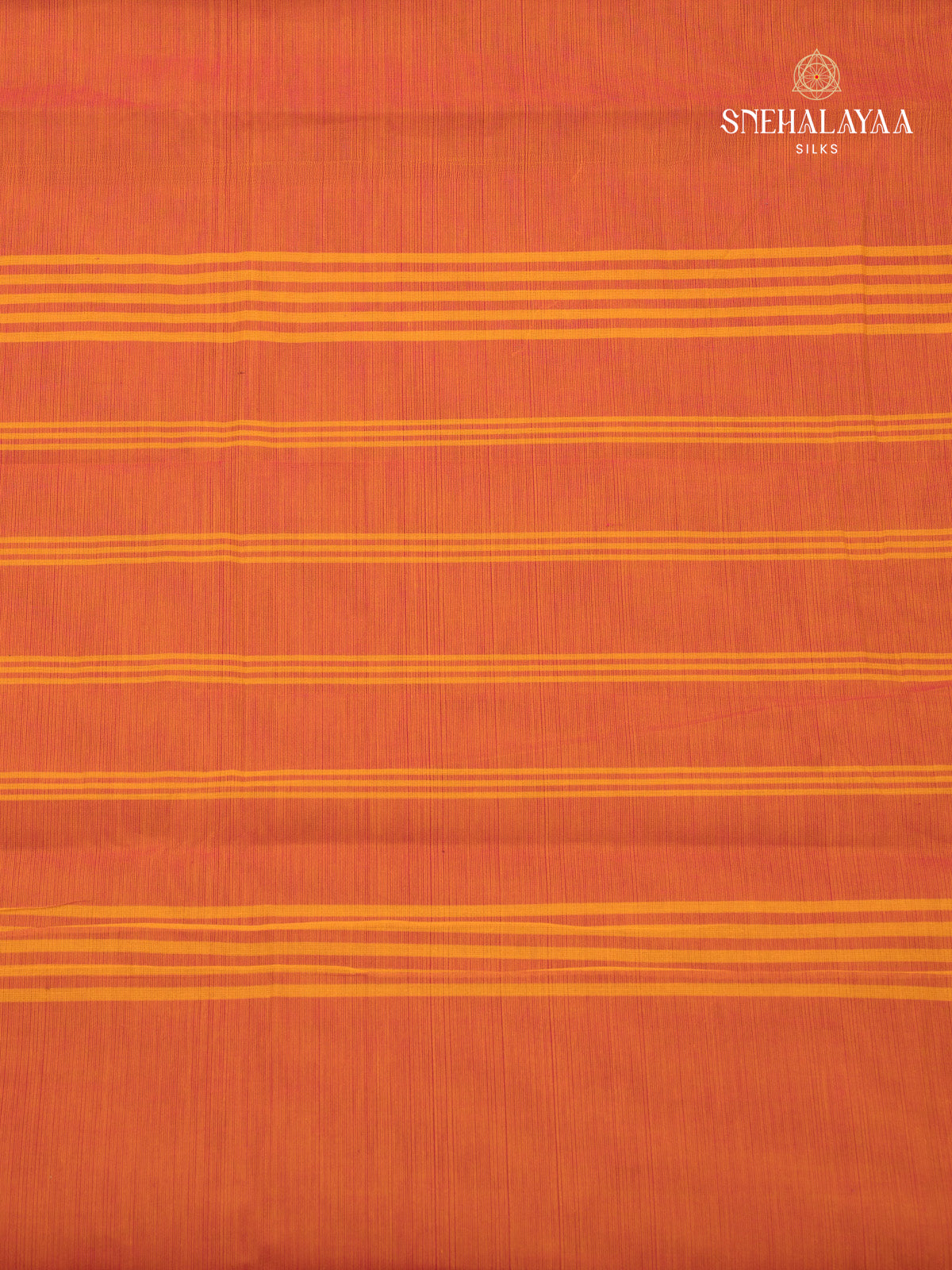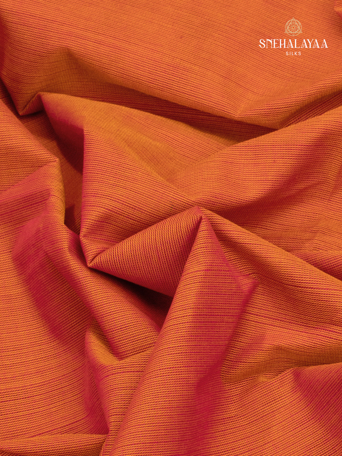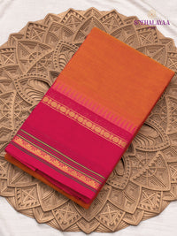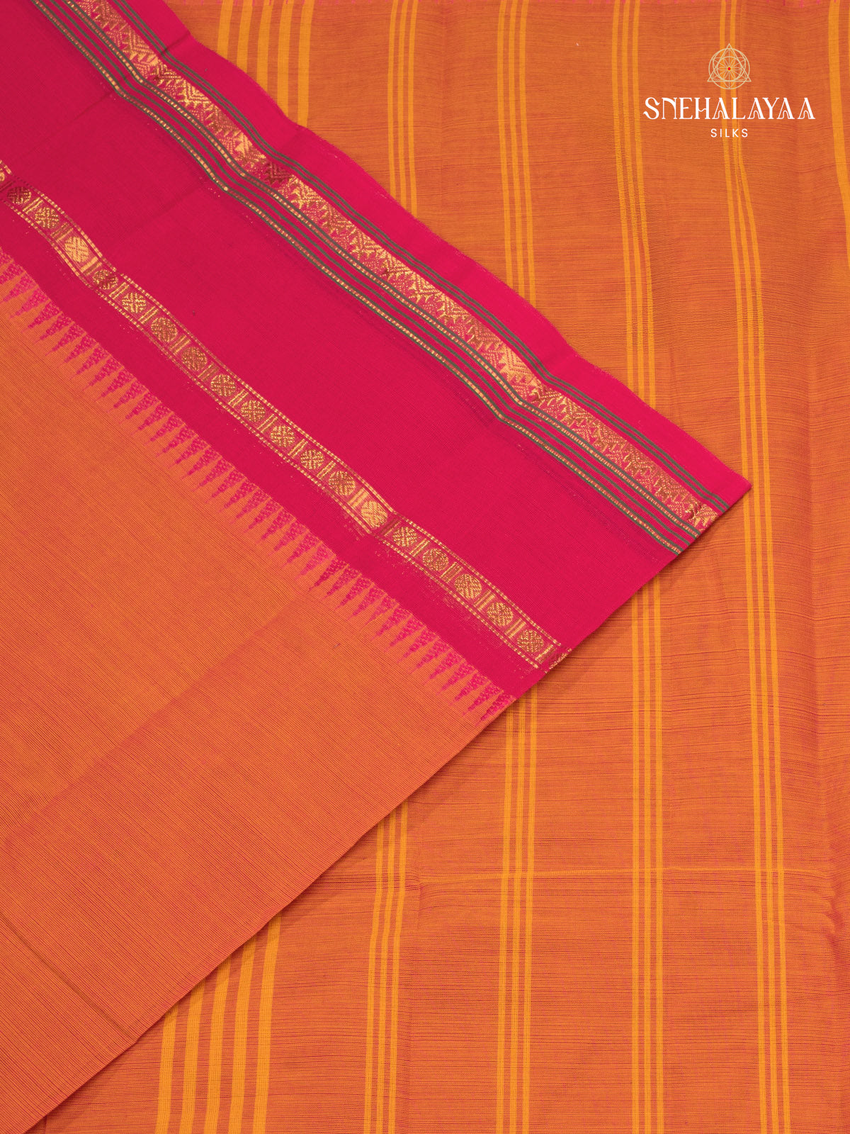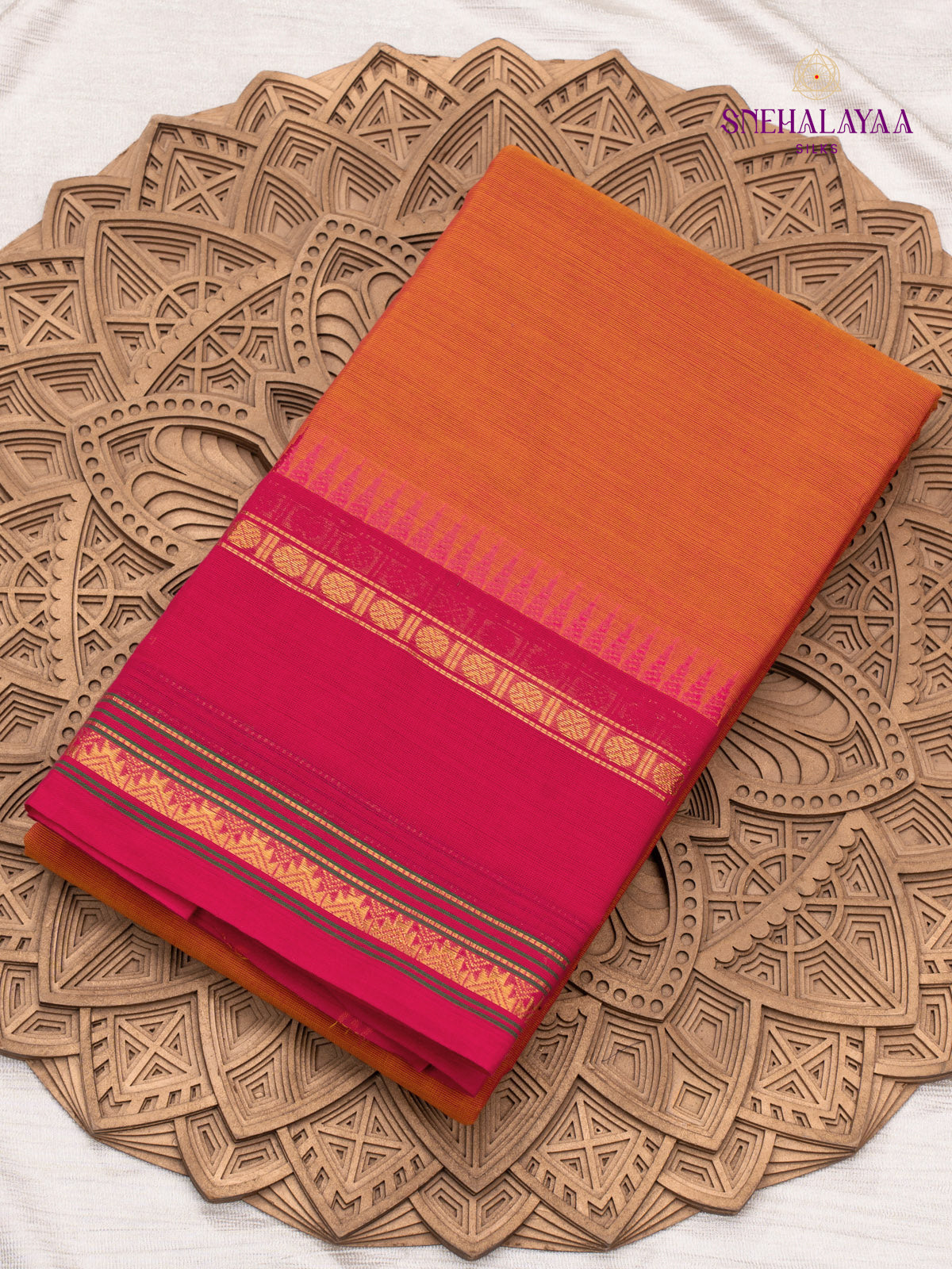 A elegant kanchi cotton saree with a warm golden-orange body. It is beautifully contrasted with a wide, solid hot pink border featuring a central stripe with intricate gold "peacock eye" and geometric patterns.