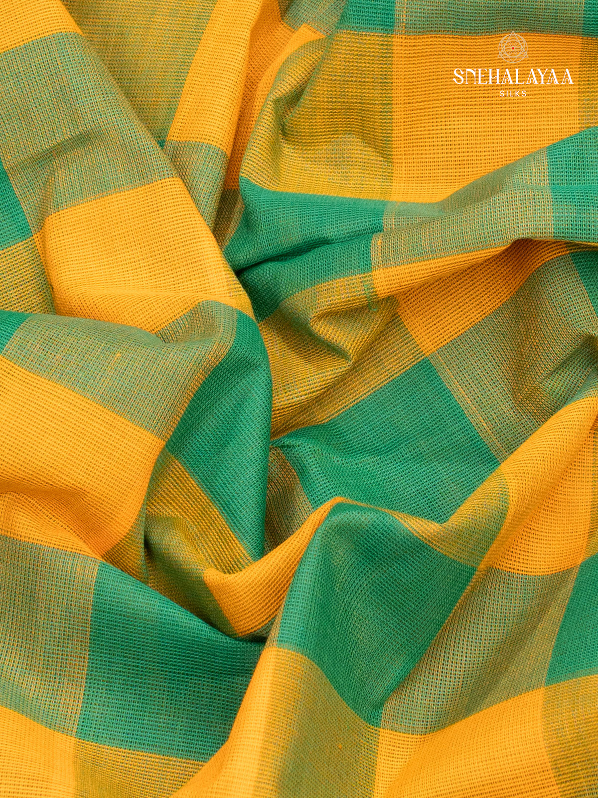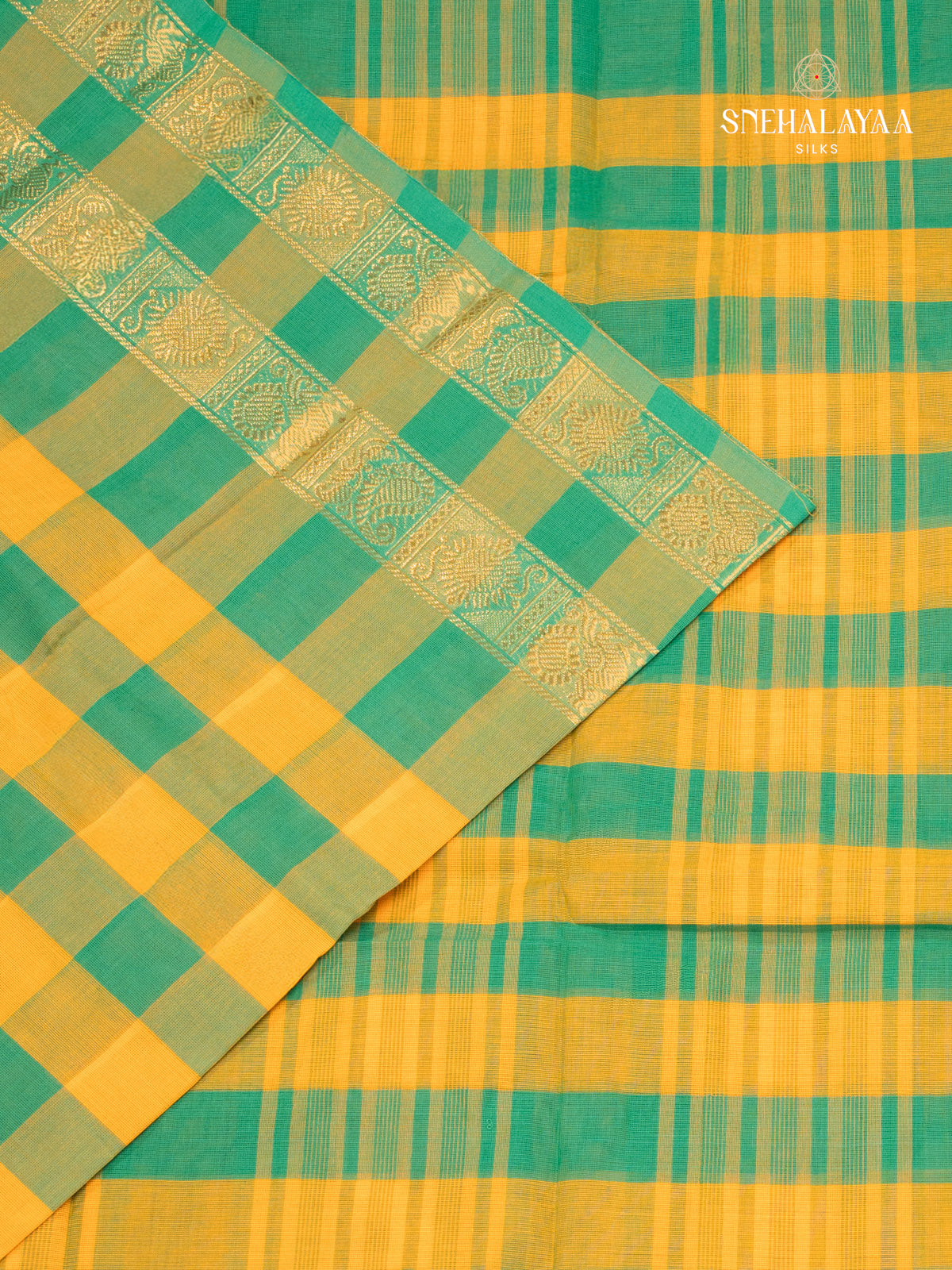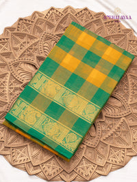 Elegant kanchi Cotton Saree featuring vibrant yellow and green checks, complemented with a traditional zari border adorned with intricate floral motifs. Lightweight and comfortable, perfect for graceful everyday wear or festive occasions.