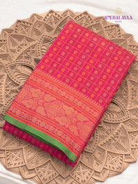 Kanchi cotton saree with a gold checked pattern. The green and gold border with elaborate floral motifs adds a festive and elegant charm.