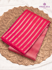 A Kanjivaram silk saree featuring a bold zig-zag design that runs gracefully throughout the body, blending traditional artistry with modern flair. The vibrant silk and striking pattern make it a perfect choice for festive celebrations.