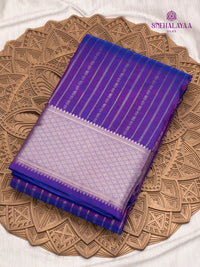 A Kanjivaram silk saree adorned with elegant paisley motifs and delicate zari lines running throughout, creating a beautiful fusion of tradition and opulence. The rich texture and intricate detailing make it a stunning choice for weddings and special events.
