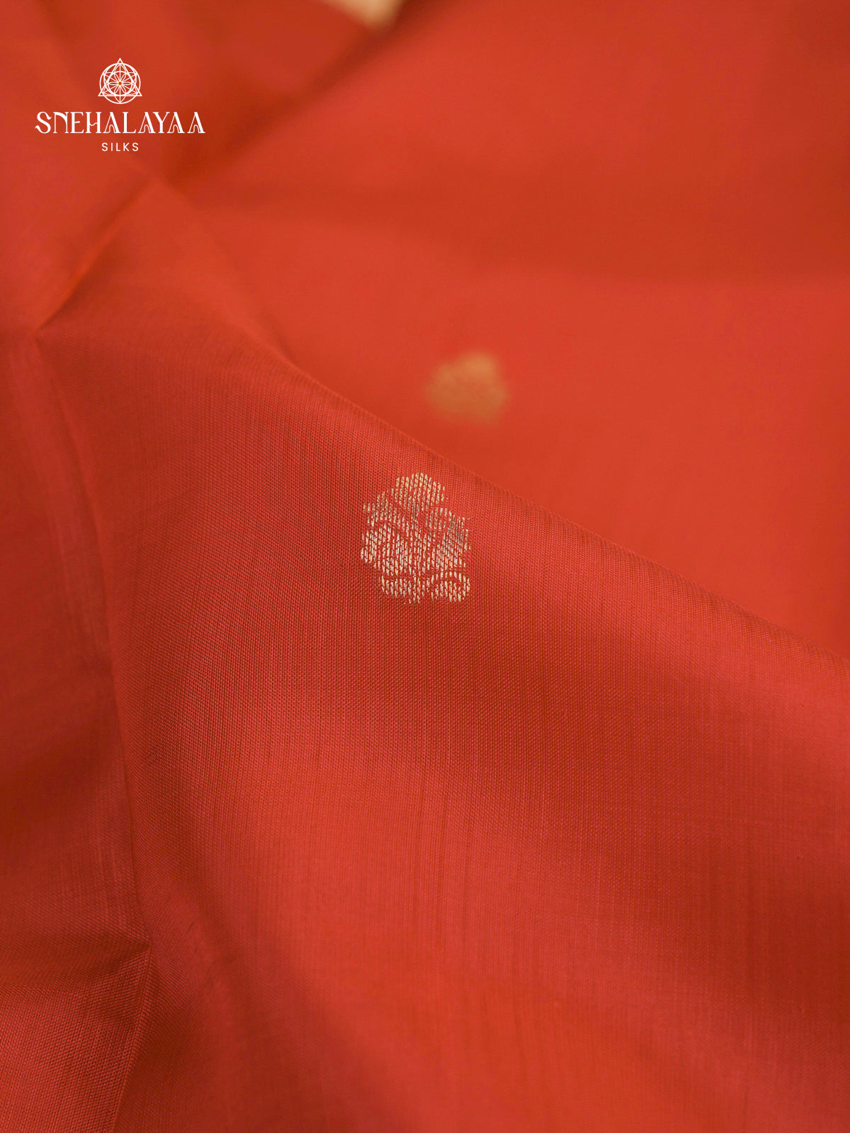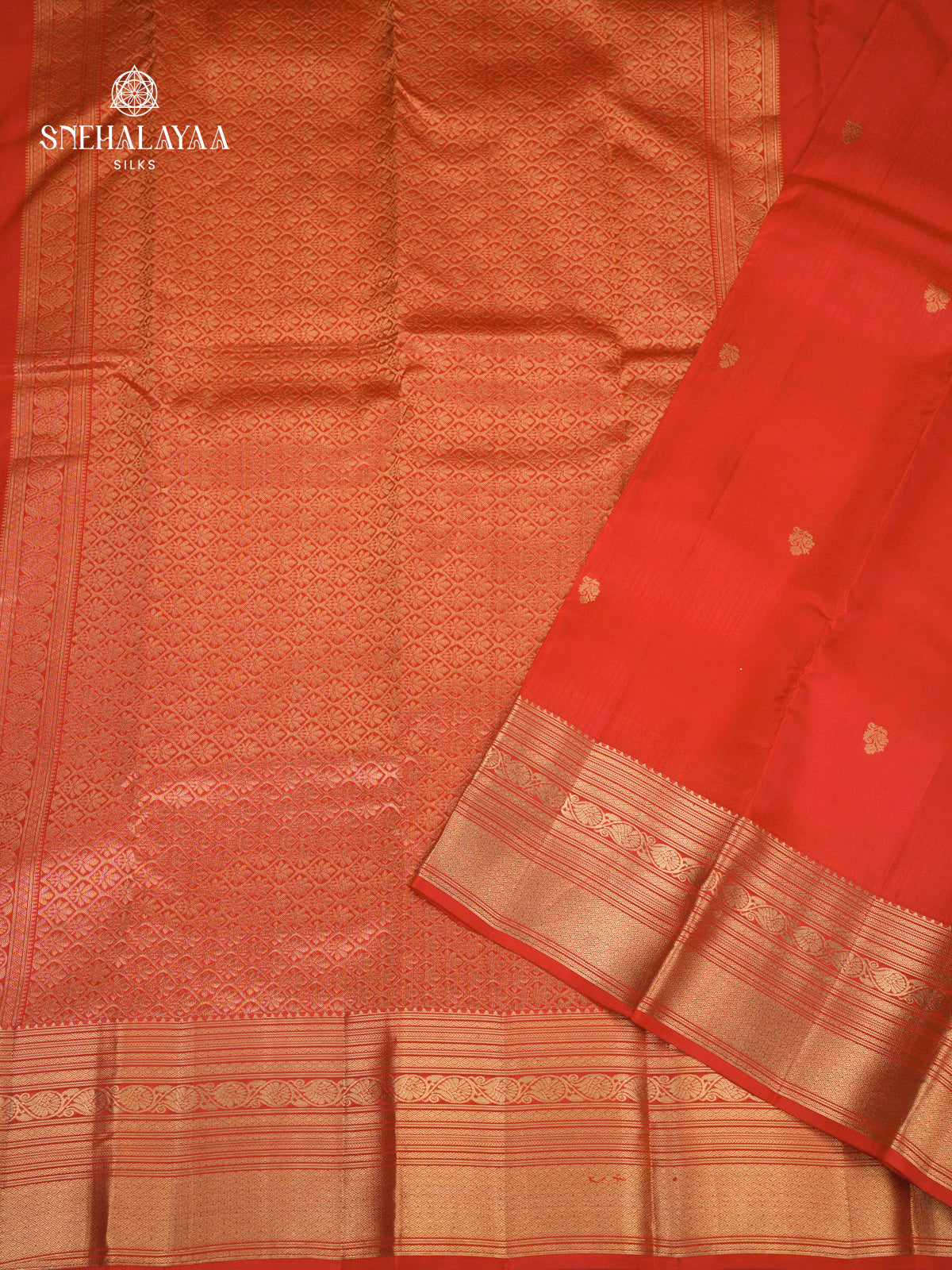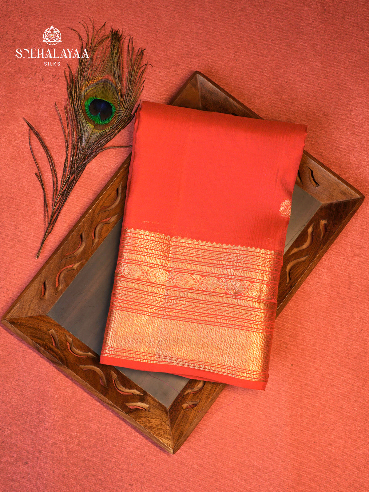 This elegant Kanjivaram silk saree features a rich orange hue crafted from premium silk, offering a sophisticated and timeless appeal. It is beautifully accented by a wide golden zari border showcasing intricate traditional motifs like floral vines and geometric patterns, perfect for grand occasions.
