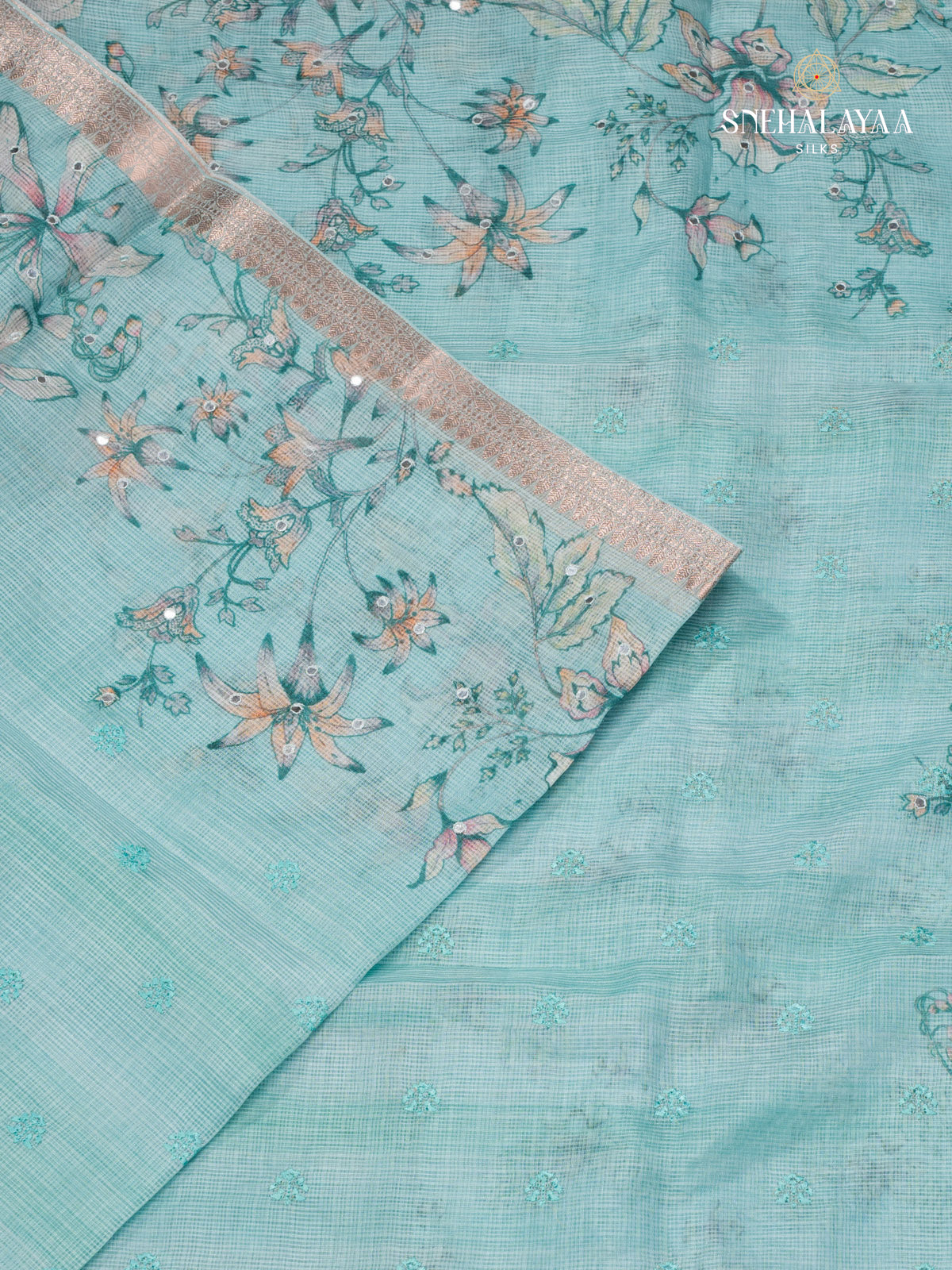 Elegant kota saree featuring intricate embroidery design, blending the sheer grace of fabric with the lightweight comfort of Kota weave.
