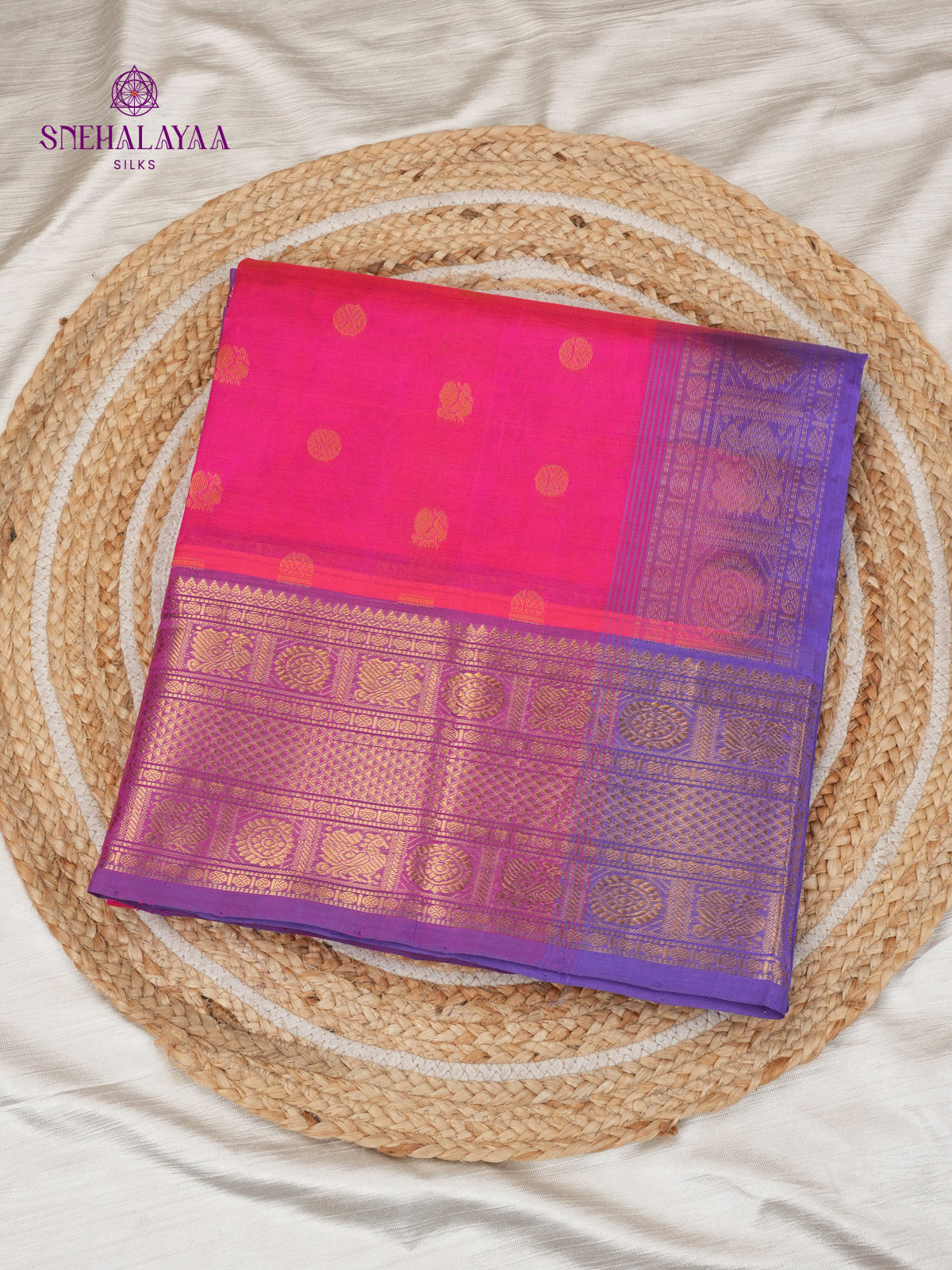 Bright Pink Kuppadam Silk Cotton Saree with Purple Zari Border