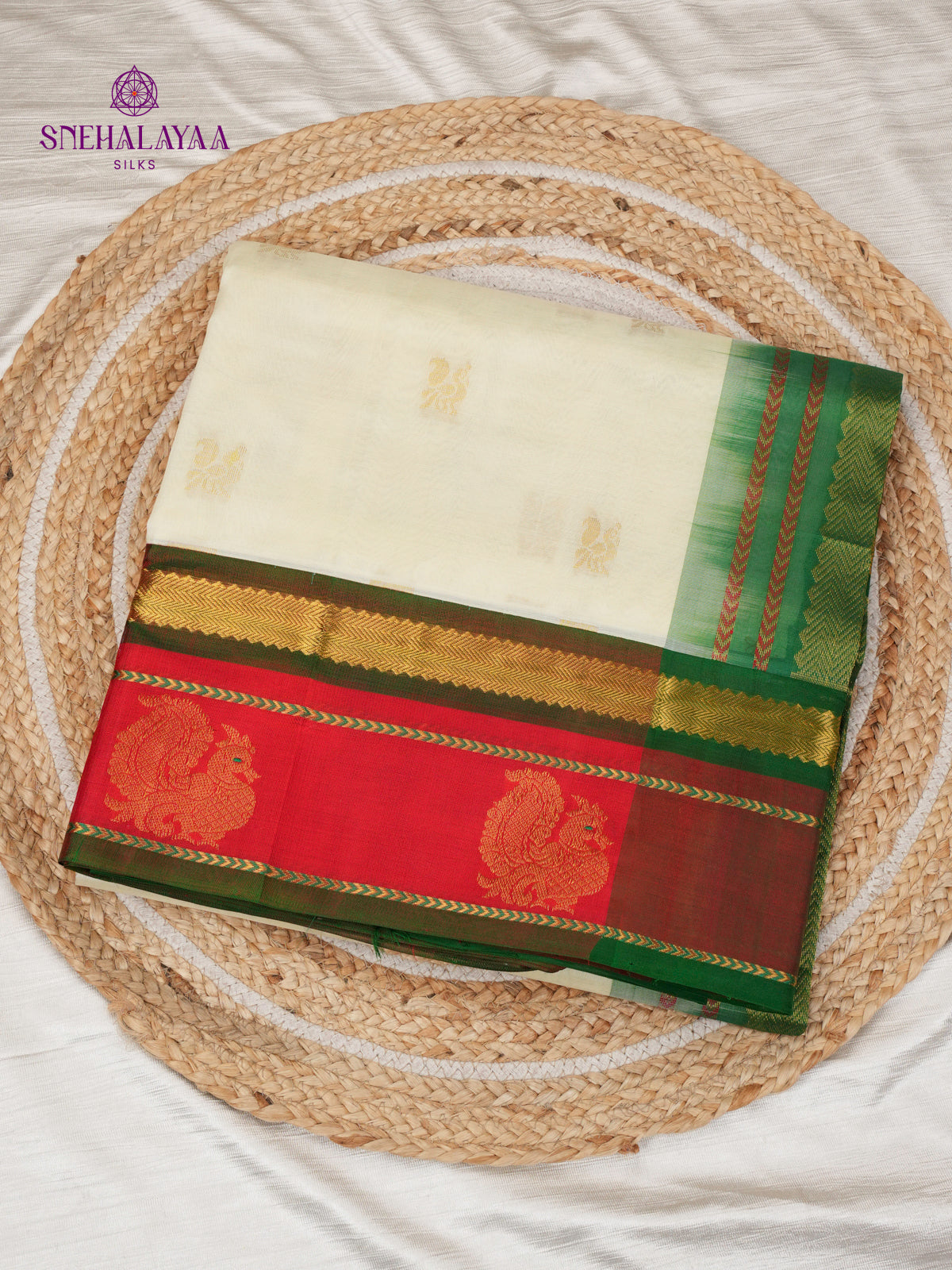 Kuppadam Silk Cotton Saree in Ivory with Green & Red Peacock Border