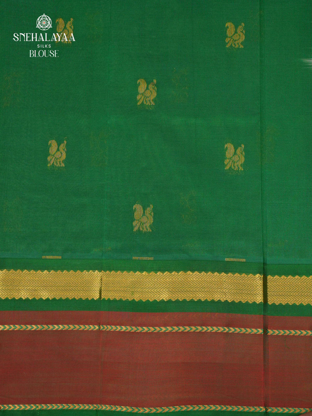 This Kuppadam silk cotton saree features an ivory body adorned with subtle gold buttas, paired with a rich green and red border woven with classic peacock motifs. The silk-cotton weave offers a balanced drape, making it suitable for long wear, festive occasions, and cultural gatherings. Comes with a matching blouse.