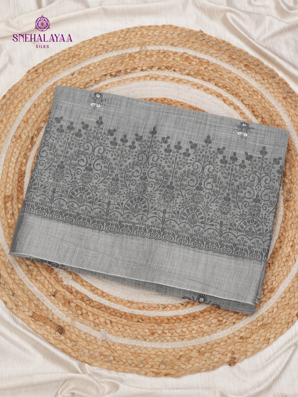 Grey Linen Tissue Embroidery Saree