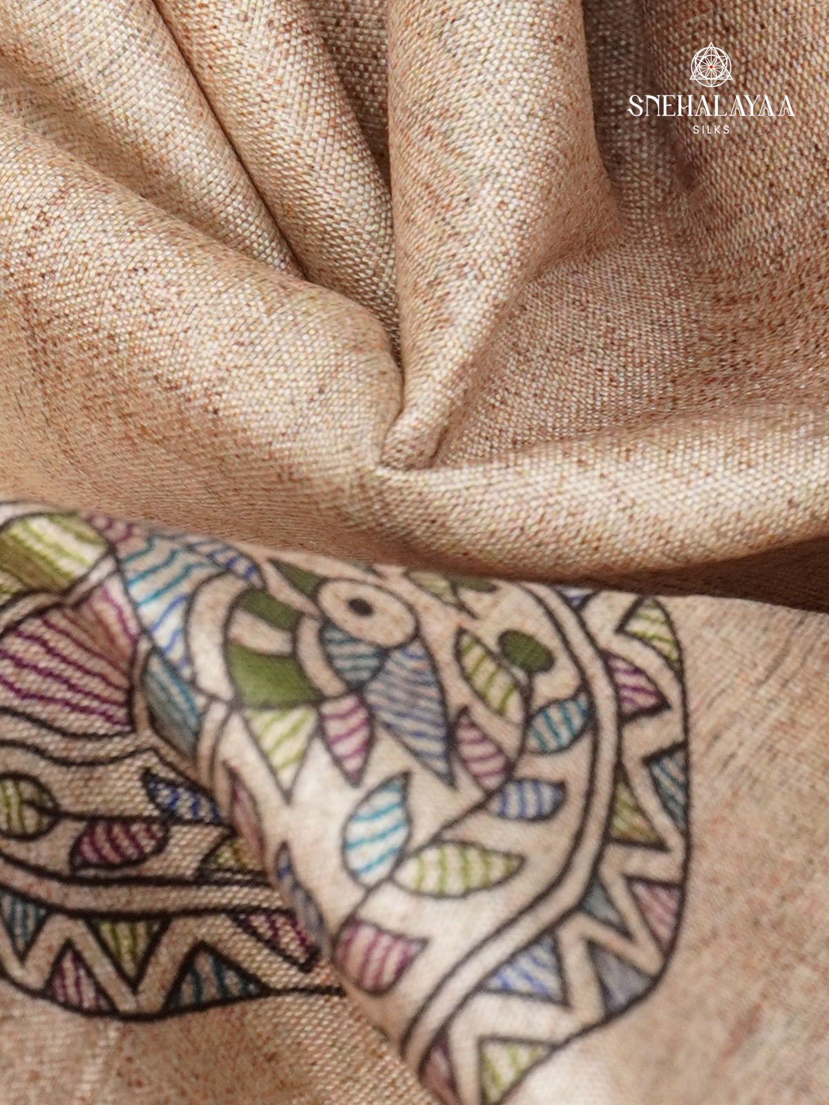 A printed Madhubani saree features intricate folk motifs inspired by traditional Mithila art. Its vibrant patterns and hand-drawn detailing bring a touch of cultural elegance to any look.