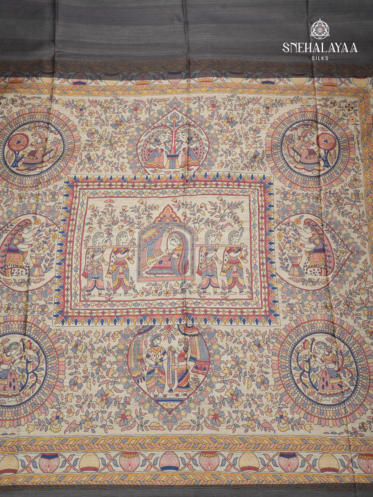 A Madhubani printed saree adorned with intricate folk motifs that celebrate India’s rich heritage. Perfect for adding artistic elegance to any traditional occasion.