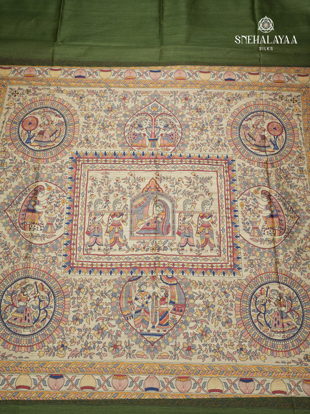 Olive Green Madhubani Printed Saree