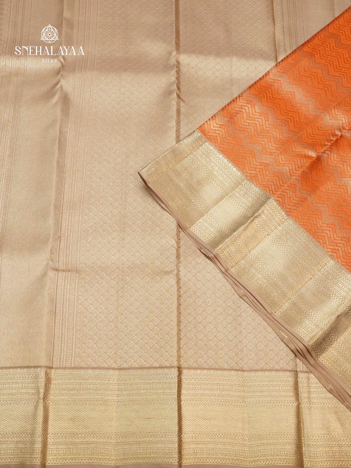 This elegant orange Kanjivaram silk saree features a contemporary zigzag chevron pattern woven throughout the body for a textured, modern look. It is finished with a traditional wide zari border that showcases intricate geometric motifs, perfectly blending classic South Indian craftsmanship with a stylish flair.