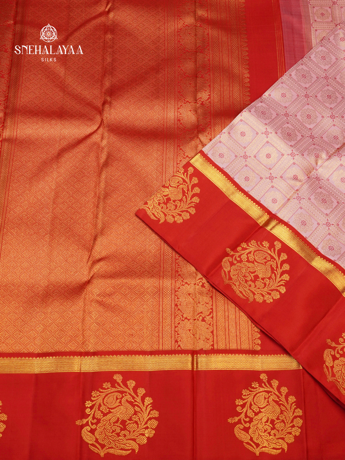 This elegant Kanjivaram silk saree features a delicate cream body adorned with intricate geometric floral motifs, paired with a bold, contrasting copper-toned border. The border is enriched with exquisite gold zari work, showcasing traditional peacock and vine patterns that epitomize South Indian craftsmanship.